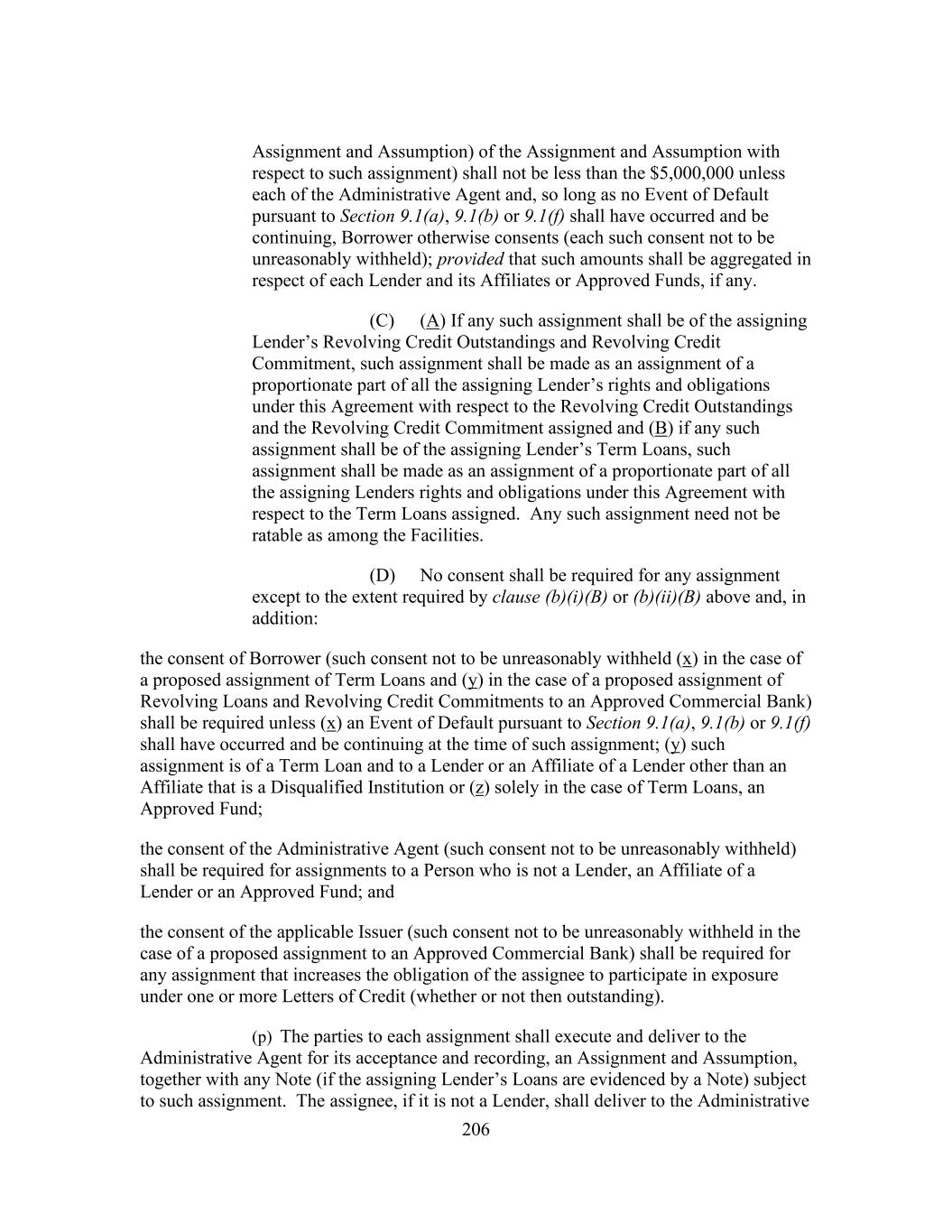 206 Assignment and Assumption) of the Assignment and Assumption with respect to such assignment) shall not be less than the $5,000,000 unless each of the Administrative Agent and, so long as no Event of Default pursuant to Section 9.1(a), 9.1(b) or 9.1(f) shall have occurred and be continuing, Borrower otherwise consents (each such consent not to be unreasonably withheld); provided that such amounts shall be aggregated in respect of each Lender and its Affiliates or Approved Funds, if any. (C) (A) If any such assignment shall be of the assigning Lender’s Revolving Credit Outstandings and Revolving Credit Commitment, such assignment shall be made as an assignment of a proportionate part of all the assigning Lender’s rights and obligations under this Agreement with respect to the Revolving Credit Outstandings and the Revolving Credit Commitment assigned and (B) if any such assignment shall be of the assigning Lender’s Term Loans, such assignment shall be made as an assignment of a proportionate part of all the assigning Lenders rights and obligations under this Agreement with respect to the Term Loans assigned. Any such assignment need not be ratable as among the Facilities. (D) No consent shall be required for any assignment except to the extent required by clause (b)(i)(B) or (b)(ii)(B) above and, in addition: the consent of Borrower (such consent not to be unreasonably withheld (x) in the case of a proposed assignment of Term Loans and (y) in the case of a proposed assignment of Revolving Loans and Revolving Credit Commitments to an Approved Commercial Bank) shall be required unless (x) an Event of Default pursuant to Section 9.1(a), 9.1(b) or 9.1(f) shall have occurred and be continuing at the time of such assignment; (y) such assignment is of a Term Loan and to a Lender or an Affiliate of a Lender other than an Affiliate that is a Disqualified Institution or (z) solely in the case of Term Loans, an Approved Fund; the consent of the Administrative Agent (such consent not to be unreasonably withheld) shall be required for assignments to a Person who is not a Lender, an Affiliate of a Lender or an Approved Fund; and the consent of the applicable Issuer (such consent not to be unreasonably withheld in the case of a proposed assignment to an Approved Commercial Bank) shall be required for any assignment that increases the obligation of the assignee to participate in exposure under one or more Letters of Credit (whether or not then outstanding). (p) The parties to each assignment shall execute and deliver to the Administrative Agent for its acceptance and recording, an Assignment and Assumption, together with any Note (if the assigning Lender’s Loans are evidenced by a Note) subject to such assignment. The assignee, if it is not a Lender, shall deliver to the Administrative
