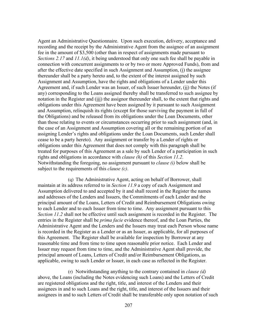 207 Agent an Administrative Questionnaire. Upon such execution, delivery, acceptance and recording and the receipt by the Administrative Agent from the assignee of an assignment fee in the amount of $3,500 (other than in respect of assignments made pursuant to Sections 2.17 and 11.1(d), it being understood that only one such fee shall be payable in connection with concurrent assignments to or by two or more Approved Funds), from and after the effective date specified in such Assignment and Assumption, (i) the assignee thereunder shall be a party hereto and, to the extent of the interest assigned by such Assignment and Assumption, have the rights and obligations of a Lender under this Agreement and, if such Lender was an Issuer, of such Issuer hereunder, (ii) the Notes (if any) corresponding to the Loans assigned thereby shall be transferred to such assignee by notation in the Register and (iii) the assignor thereunder shall, to the extent that rights and obligations under this Agreement have been assigned by it pursuant to such Assignment and Assumption, relinquish its rights (except for those surviving the payment in full of the Obligations) and be released from its obligations under the Loan Documents, other than those relating to events or circumstances occurring prior to such assignment (and, in the case of an Assignment and Assumption covering all or the remaining portion of an assigning Lender’s rights and obligations under the Loan Documents, such Lender shall cease to be a party hereto). Any assignment or transfer by a Lender of rights or obligations under this Agreement that does not comply with this paragraph shall be treated for purposes of this Agreement as a sale by such Lender of a participation in such rights and obligations in accordance with clause (h) of this Section 11.2. Notwithstanding the foregoing, no assignment pursuant to clause (i) below shall be subject to the requirements of this clause (c). (q) The Administrative Agent, acting on behalf of Borrower, shall maintain at its address referred to in Section 11.9 a copy of each Assignment and Assumption delivered to and accepted by it and shall record in the Register the names and addresses of the Lenders and Issuers, the Commitments of each Lender and the principal amount of the Loans, Letters of Credit and Reimbursement Obligations owing to each Lender and to each Issuer from time to time. Any assignment pursuant to this Section 11.2 shall not be effective until such assignment is recorded in the Register. The entries in the Register shall be prima facie evidence thereof, and the Loan Parties, the Administrative Agent and the Lenders and the Issuers may treat each Person whose name is recorded in the Register as a Lender or as an Issuer, as applicable, for all purposes of this Agreement. The Register shall be available for inspection by Borrower at any reasonable time and from time to time upon reasonable prior notice. Each Lender and Issuer may request from time to time, and the Administrative Agent shall provide, the principal amount of Loans, Letters of Credit and/or Reimbursement Obligations, as applicable, owing to such Lender or Issuer, in each case as reflected in the Register. (r) Notwithstanding anything to the contrary contained in clause (d) above, the Loans (including the Notes evidencing such Loans) and the Letters of Credit are registered obligations and the right, title, and interest of the Lenders and their assignees in and to such Loans and the right, title, and interest of the Issuers and their assignees in and to such Letters of Credit shall be transferable only upon notation of such
