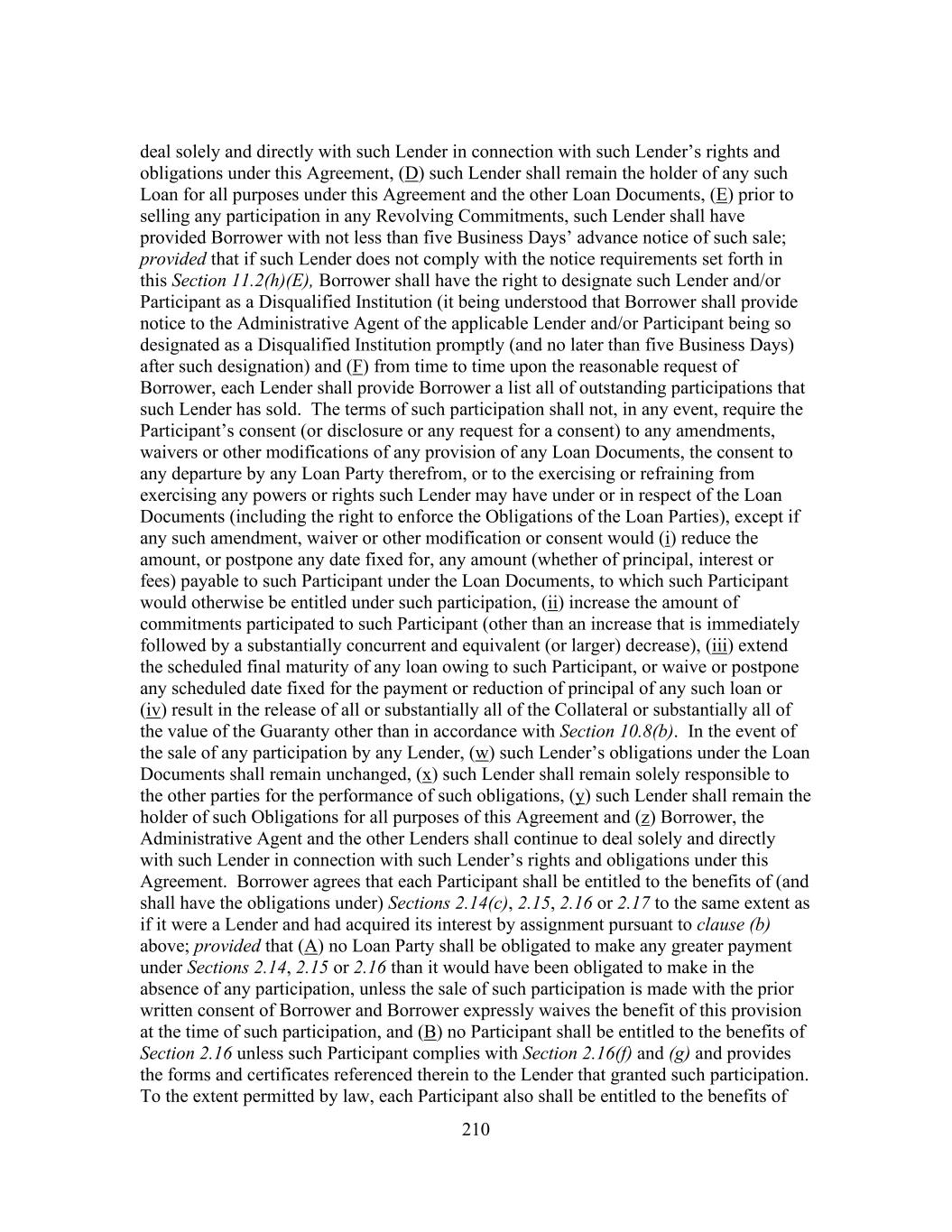 210 deal solely and directly with such Lender in connection with such Lender’s rights and obligations under this Agreement, (D) such Lender shall remain the holder of any such Loan for all purposes under this Agreement and the other Loan Documents, (E) prior to selling any participation in any Revolving Commitments, such Lender shall have provided Borrower with not less than five Business Days’ advance notice of such sale; provided that if such Lender does not comply with the notice requirements set forth in this Section 11.2(h)(E), Borrower shall have the right to designate such Lender and/or Participant as a Disqualified Institution (it being understood that Borrower shall provide notice to the Administrative Agent of the applicable Lender and/or Participant being so designated as a Disqualified Institution promptly (and no later than five Business Days) after such designation) and (F) from time to time upon the reasonable request of Borrower, each Lender shall provide Borrower a list all of outstanding participations that such Lender has sold. The terms of such participation shall not, in any event, require the Participant’s consent (or disclosure or any request for a consent) to any amendments, waivers or other modifications of any provision of any Loan Documents, the consent to any departure by any Loan Party therefrom, or to the exercising or refraining from exercising any powers or rights such Lender may have under or in respect of the Loan Documents (including the right to enforce the Obligations of the Loan Parties), except if any such amendment, waiver or other modification or consent would (i) reduce the amount, or postpone any date fixed for, any amount (whether of principal, interest or fees) payable to such Participant under the Loan Documents, to which such Participant would otherwise be entitled under such participation, (ii) increase the amount of commitments participated to such Participant (other than an increase that is immediately followed by a substantially concurrent and equivalent (or larger) decrease), (iii) extend the scheduled final maturity of any loan owing to such Participant, or waive or postpone any scheduled date fixed for the payment or reduction of principal of any such loan or (iv) result in the release of all or substantially all of the Collateral or substantially all of the value of the Guaranty other than in accordance with Section 10.8(b). In the event of the sale of any participation by any Lender, (w) such Lender’s obligations under the Loan Documents shall remain unchanged, (x) such Lender shall remain solely responsible to the other parties for the performance of such obligations, (y) such Lender shall remain the holder of such Obligations for all purposes of this Agreement and (z) Borrower, the Administrative Agent and the other Lenders shall continue to deal solely and directly with such Lender in connection with such Lender’s rights and obligations under this Agreement. Borrower agrees that each Participant shall be entitled to the benefits of (and shall have the obligations under) Sections 2.14(c), 2.15, 2.16 or 2.17 to the same extent as if it were a Lender and had acquired its interest by assignment pursuant to clause (b) above; provided that (A) no Loan Party shall be obligated to make any greater payment under Sections 2.14, 2.15 or 2.16 than it would have been obligated to make in the absence of any participation, unless the sale of such participation is made with the prior written consent of Borrower and Borrower expressly waives the benefit of this provision at the time of such participation, and (B) no Participant shall be entitled to the benefits of Section 2.16 unless such Participant complies with Section 2.16(f) and (g) and provides the forms and certificates referenced therein to the Lender that granted such participation. To the extent permitted by law, each Participant also shall be entitled to the benefits of