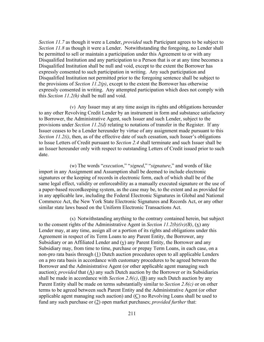211 Section 11.7 as though it were a Lender, provided such Participant agrees to be subject to Section 11.8 as though it were a Lender. Notwithstanding the foregoing, no Lender shall be permitted to sell or maintain a participation under this Agreement to or with any Disqualified Institution and any participation to a Person that is or at any time becomes a Disqualified Institution shall be null and void, except to the extent the Borrower has expressly consented to such participation in writing. Any such participation and Disqualified Institution not permitted prior to the foregoing sentence shall be subject to the provisions of Section 11.2(p), except to the extent the Borrower has otherwise expressly consented in writing. Any attempted participation which does not comply with this Section 11.2(h) shall be null and void. (v) Any Issuer may at any time assign its rights and obligations hereunder to any other Revolving Credit Lender by an instrument in form and substance satisfactory to Borrower, the Administrative Agent, such Issuer and such Lender, subject to the provisions under Section 11.2(d) relating to notations of transfer in the Register. If any Issuer ceases to be a Lender hereunder by virtue of any assignment made pursuant to this Section 11.2(i), then, as of the effective date of such cessation, such Issuer’s obligations to Issue Letters of Credit pursuant to Section 2.4 shall terminate and such Issuer shall be an Issuer hereunder only with respect to outstanding Letters of Credit issued prior to such date. (w) The words “execution,” “signed,” “signature,” and words of like import in any Assignment and Assumption shall be deemed to include electronic signatures or the keeping of records in electronic form, each of which shall be of the same legal effect, validity or enforceability as a manually executed signature or the use of a paper-based recordkeeping system, as the case may be, to the extent and as provided for in any applicable law, including the Federal Electronic Signatures in Global and National Commerce Act, the New York State Electronic Signatures and Records Act, or any other similar state laws based on the Uniform Electronic Transactions Act. (x) Notwithstanding anything to the contrary contained herein, but subject to the consent rights of the Administrative Agent in Section 11.2(b)(iv)(B), (x) any Lender may, at any time, assign all or a portion of its rights and obligations under this Agreement in respect of its Term Loans to any Parent Entity, the Borrower, any Subsidiary or an Affiliated Lender and (y) any Parent Entity, the Borrower and any Subsidiary may, from time to time, purchase or prepay Term Loans, in each case, on a non-pro rata basis through (1) Dutch auction procedures open to all applicable Lenders on a pro rata basis in accordance with customary procedures to be agreed between the Borrower and the Administrative Agent (or other applicable agent managing such auction); provided that (A) any such Dutch auction by the Borrower or its Subsidiaries shall be made in accordance with Section 2.8(c), (B) any such Dutch auction by any Parent Entity shall be made on terms substantially similar to Section 2.8(c) or on other terms to be agreed between such Parent Entity and the Administrative Agent (or other applicable agent managing such auction) and (C) no Revolving Loans shall be used to fund any such purchase or (2) open market purchases; provided further that: