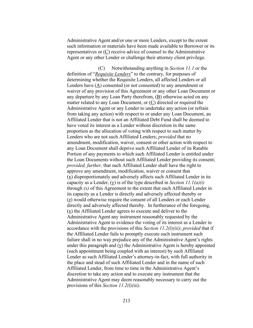 213 Administrative Agent and/or one or more Lenders, except to the extent such information or materials have been made available to Borrower or its representatives or (C) receive advice of counsel to the Administrative Agent or any other Lender or challenge their attorney client privilege. (C) Notwithstanding anything in Section 11.1 or the definition of “Requisite Lenders” to the contrary, for purposes of determining whether the Requisite Lenders, all affected Lenders or all Lenders have (A) consented (or not consented) to any amendment or waiver of any provision of this Agreement or any other Loan Document or any departure by any Loan Party therefrom, (B) otherwise acted on any matter related to any Loan Document, or (C) directed or required the Administrative Agent or any Lender to undertake any action (or refrain from taking any action) with respect to or under any Loan Document, an Affiliated Lender that is not an Affiliated Debt Fund shall be deemed to have voted its interest as a Lender without discretion in the same proportion as the allocation of voting with respect to such matter by Lenders who are not such Affiliated Lenders; provided that no amendment, modification, waiver, consent or other action with respect to any Loan Document shall deprive such Affiliated Lender of its Ratable Portion of any payments to which such Affiliated Lender is entitled under the Loan Documents without such Affiliated Lender providing its consent; provided, further, that such Affiliated Lender shall have the right to approve any amendment, modification, waiver or consent that (x) disproportionately and adversely affects such Affiliated Lender in its capacity as a Lender, (y) is of the type described in Section 11.1(a)(i) through (x) of this Agreement to the extent that such Affiliated Lender in its capacity as a Lender is directly and adversely affected thereby or (z) would otherwise require the consent of all Lenders or each Lender directly and adversely affected thereby. In furtherance of the foregoing, (x) the Affiliated Lender agrees to execute and deliver to the Administrative Agent any instrument reasonably requested by the Administrative Agent to evidence the voting of its interest as a Lender in accordance with the provisions of this Section 11.2(l)(iii); provided that if the Affiliated Lender fails to promptly execute such instrument such failure shall in no way prejudice any of the Administrative Agent’s rights under this paragraph and (y) the Administrative Agent is hereby appointed (such appointment being coupled with an interest) by such Affiliated Lender as such Affiliated Lender’s attorney-in-fact, with full authority in the place and stead of such Affiliated Lender and in the name of such Affiliated Lender, from time to time in the Administrative Agent’s discretion to take any action and to execute any instrument that the Administrative Agent may deem reasonably necessary to carry out the provisions of this Section 11.2(l)(iii).