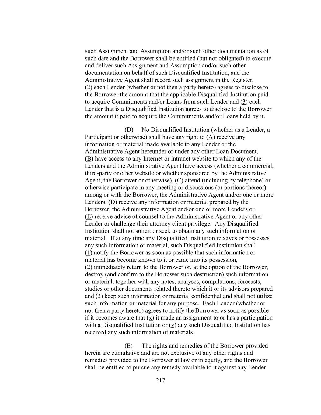 217 such Assignment and Assumption and/or such other documentation as of such date and the Borrower shall be entitled (but not obligated) to execute and deliver such Assignment and Assumption and/or such other documentation on behalf of such Disqualified Institution, and the Administrative Agent shall record such assignment in the Register, (2) each Lender (whether or not then a party hereto) agrees to disclose to the Borrower the amount that the applicable Disqualified Institution paid to acquire Commitments and/or Loans from such Lender and (3) each Lender that is a Disqualified Institution agrees to disclose to the Borrower the amount it paid to acquire the Commitments and/or Loans held by it. (D) No Disqualified Institution (whether as a Lender, a Participant or otherwise) shall have any right to (A) receive any information or material made available to any Lender or the Administrative Agent hereunder or under any other Loan Document, (B) have access to any Internet or intranet website to which any of the Lenders and the Administrative Agent have access (whether a commercial, third-party or other website or whether sponsored by the Administrative Agent, the Borrower or otherwise), (C) attend (including by telephone) or otherwise participate in any meeting or discussions (or portions thereof) among or with the Borrower, the Administrative Agent and/or one or more Lenders, (D) receive any information or material prepared by the Borrower, the Administrative Agent and/or one or more Lenders or (E) receive advice of counsel to the Administrative Agent or any other Lender or challenge their attorney client privilege. Any Disqualified Institution shall not solicit or seek to obtain any such information or material. If at any time any Disqualified Institution receives or possesses any such information or material, such Disqualified Institution shall (1) notify the Borrower as soon as possible that such information or material has become known to it or came into its possession, (2) immediately return to the Borrower or, at the option of the Borrower, destroy (and confirm to the Borrower such destruction) such information or material, together with any notes, analyses, compilations, forecasts, studies or other documents related thereto which it or its advisors prepared and (3) keep such information or material confidential and shall not utilize such information or material for any purpose. Each Lender (whether or not then a party hereto) agrees to notify the Borrower as soon as possible if it becomes aware that (x) it made an assignment to or has a participation with a Disqualified Institution or (y) any such Disqualified Institution has received any such information of materials. (E) The rights and remedies of the Borrower provided herein are cumulative and are not exclusive of any other rights and remedies provided to the Borrower at law or in equity, and the Borrower shall be entitled to pursue any remedy available to it against any Lender