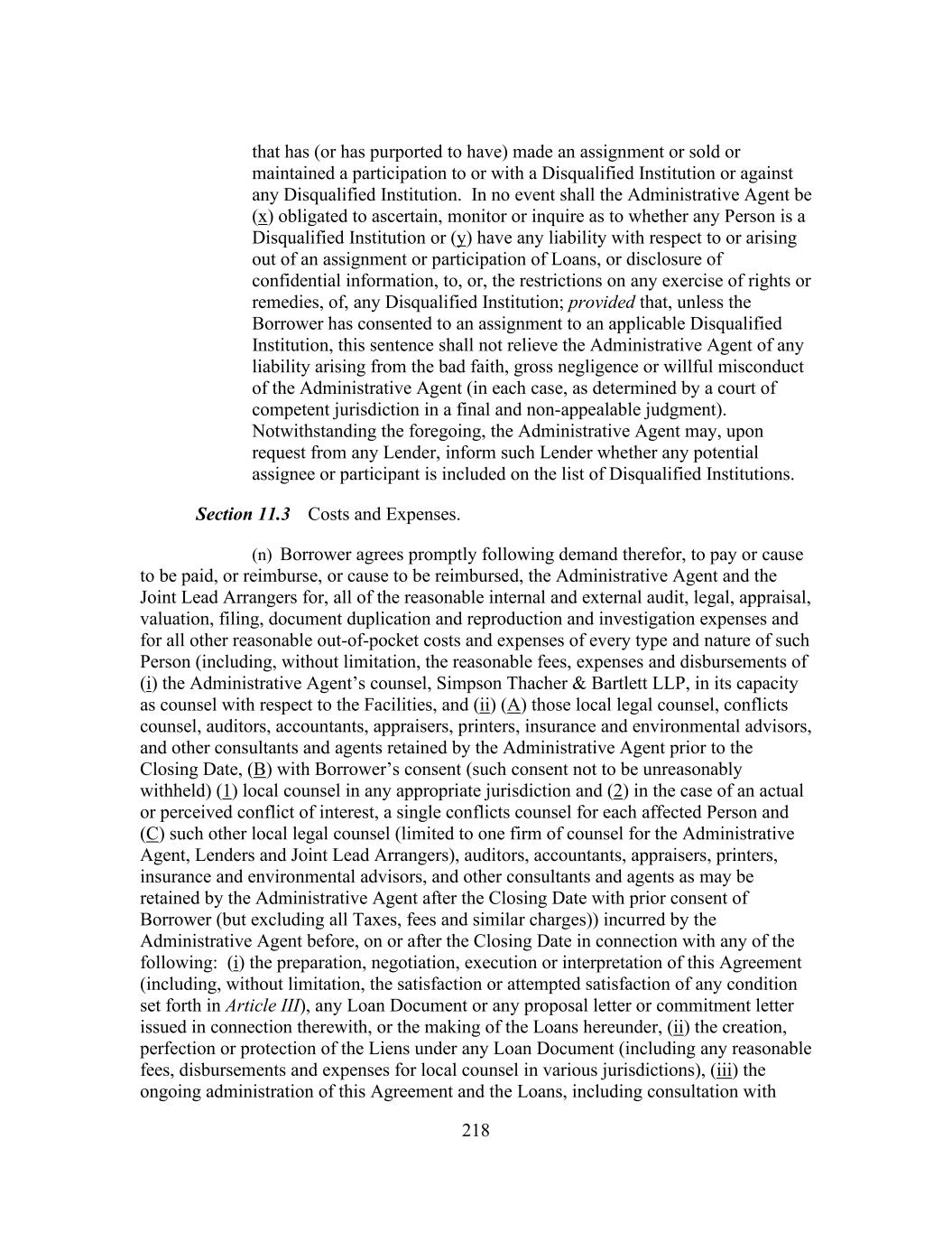 218 that has (or has purported to have) made an assignment or sold or maintained a participation to or with a Disqualified Institution or against any Disqualified Institution. In no event shall the Administrative Agent be (x) obligated to ascertain, monitor or inquire as to whether any Person is a Disqualified Institution or (y) have any liability with respect to or arising out of an assignment or participation of Loans, or disclosure of confidential information, to, or, the restrictions on any exercise of rights or remedies, of, any Disqualified Institution; provided that, unless the Borrower has consented to an assignment to an applicable Disqualified Institution, this sentence shall not relieve the Administrative Agent of any liability arising from the bad faith, gross negligence or willful misconduct of the Administrative Agent (in each case, as determined by a court of competent jurisdiction in a final and non-appealable judgment). Notwithstanding the foregoing, the Administrative Agent may, upon request from any Lender, inform such Lender whether any potential assignee or participant is included on the list of Disqualified Institutions. Section 11.3 Costs and Expenses. (n) Borrower agrees promptly following demand therefor, to pay or cause to be paid, or reimburse, or cause to be reimbursed, the Administrative Agent and the Joint Lead Arrangers for, all of the reasonable internal and external audit, legal, appraisal, valuation, filing, document duplication and reproduction and investigation expenses and for all other reasonable out-of-pocket costs and expenses of every type and nature of such Person (including, without limitation, the reasonable fees, expenses and disbursements of (i) the Administrative Agent’s counsel, Simpson Thacher & Bartlett LLP, in its capacity as counsel with respect to the Facilities, and (ii) (A) those local legal counsel, conflicts counsel, auditors, accountants, appraisers, printers, insurance and environmental advisors, and other consultants and agents retained by the Administrative Agent prior to the Closing Date, (B) with Borrower’s consent (such consent not to be unreasonably withheld) (1) local counsel in any appropriate jurisdiction and (2) in the case of an actual or perceived conflict of interest, a single conflicts counsel for each affected Person and (C) such other local legal counsel (limited to one firm of counsel for the Administrative Agent, Lenders and Joint Lead Arrangers), auditors, accountants, appraisers, printers, insurance and environmental advisors, and other consultants and agents as may be retained by the Administrative Agent after the Closing Date with prior consent of Borrower (but excluding all Taxes, fees and similar charges)) incurred by the Administrative Agent before, on or after the Closing Date in connection with any of the following: (i) the preparation, negotiation, execution or interpretation of this Agreement (including, without limitation, the satisfaction or attempted satisfaction of any condition set forth in Article III), any Loan Document or any proposal letter or commitment letter issued in connection therewith, or the making of the Loans hereunder, (ii) the creation, perfection or protection of the Liens under any Loan Document (including any reasonable fees, disbursements and expenses for local counsel in various jurisdictions), (iii) the ongoing administration of this Agreement and the Loans, including consultation with