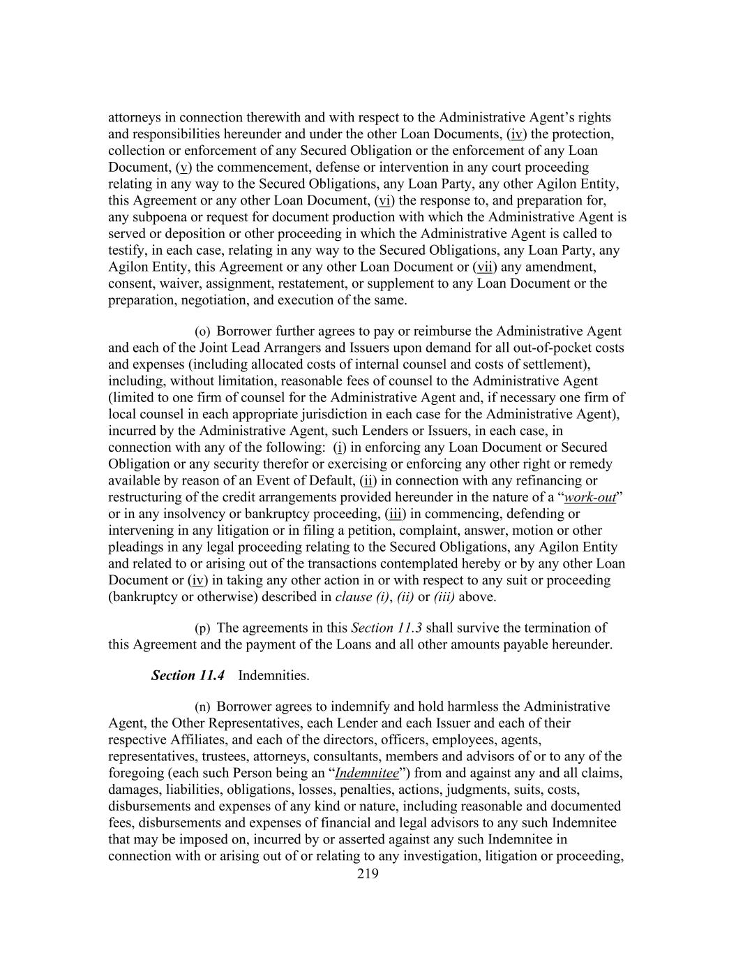219 attorneys in connection therewith and with respect to the Administrative Agent’s rights and responsibilities hereunder and under the other Loan Documents, (iv) the protection, collection or enforcement of any Secured Obligation or the enforcement of any Loan Document, (v) the commencement, defense or intervention in any court proceeding relating in any way to the Secured Obligations, any Loan Party, any other Agilon Entity, this Agreement or any other Loan Document, (vi) the response to, and preparation for, any subpoena or request for document production with which the Administrative Agent is served or deposition or other proceeding in which the Administrative Agent is called to testify, in each case, relating in any way to the Secured Obligations, any Loan Party, any Agilon Entity, this Agreement or any other Loan Document or (vii) any amendment, consent, waiver, assignment, restatement, or supplement to any Loan Document or the preparation, negotiation, and execution of the same. (o) Borrower further agrees to pay or reimburse the Administrative Agent and each of the Joint Lead Arrangers and Issuers upon demand for all out-of-pocket costs and expenses (including allocated costs of internal counsel and costs of settlement), including, without limitation, reasonable fees of counsel to the Administrative Agent (limited to one firm of counsel for the Administrative Agent and, if necessary one firm of local counsel in each appropriate jurisdiction in each case for the Administrative Agent), incurred by the Administrative Agent, such Lenders or Issuers, in each case, in connection with any of the following: (i) in enforcing any Loan Document or Secured Obligation or any security therefor or exercising or enforcing any other right or remedy available by reason of an Event of Default, (ii) in connection with any refinancing or restructuring of the credit arrangements provided hereunder in the nature of a “work-out” or in any insolvency or bankruptcy proceeding, (iii) in commencing, defending or intervening in any litigation or in filing a petition, complaint, answer, motion or other pleadings in any legal proceeding relating to the Secured Obligations, any Agilon Entity and related to or arising out of the transactions contemplated hereby or by any other Loan Document or (iv) in taking any other action in or with respect to any suit or proceeding (bankruptcy or otherwise) described in clause (i), (ii) or (iii) above. (p) The agreements in this Section 11.3 shall survive the termination of this Agreement and the payment of the Loans and all other amounts payable hereunder. Section 11.4 Indemnities. (n) Borrower agrees to indemnify and hold harmless the Administrative Agent, the Other Representatives, each Lender and each Issuer and each of their respective Affiliates, and each of the directors, officers, employees, agents, representatives, trustees, attorneys, consultants, members and advisors of or to any of the foregoing (each such Person being an “Indemnitee”) from and against any and all claims, damages, liabilities, obligations, losses, penalties, actions, judgments, suits, costs, disbursements and expenses of any kind or nature, including reasonable and documented fees, disbursements and expenses of financial and legal advisors to any such Indemnitee that may be imposed on, incurred by or asserted against any such Indemnitee in connection with or arising out of or relating to any investigation, litigation or proceeding,