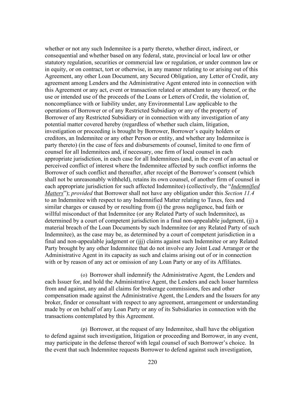220 whether or not any such Indemnitee is a party thereto, whether direct, indirect, or consequential and whether based on any federal, state, provincial or local law or other statutory regulation, securities or commercial law or regulation, or under common law or in equity, or on contract, tort or otherwise, in any manner relating to or arising out of this Agreement, any other Loan Document, any Secured Obligation, any Letter of Credit, any agreement among Lenders and the Administrative Agent entered into in connection with this Agreement or any act, event or transaction related or attendant to any thereof, or the use or intended use of the proceeds of the Loans or Letters of Credit, the violation of, noncompliance with or liability under, any Environmental Law applicable to the operations of Borrower or of any Restricted Subsidiary or any of the property of Borrower of any Restricted Subsidiary or in connection with any investigation of any potential matter covered hereby (regardless of whether such claim, litigation, investigation or proceeding is brought by Borrower, Borrower’s equity holders or creditors, an Indemnitee or any other Person or entity, and whether any Indemnitee is party thereto) (in the case of fees and disbursements of counsel, limited to one firm of counsel for all Indemnitees and, if necessary, one firm of local counsel in each appropriate jurisdiction, in each case for all Indemnitees (and, in the event of an actual or perceived conflict of interest where the Indemnitee affected by such conflict informs the Borrower of such conflict and thereafter, after receipt of the Borrower’s consent (which shall not be unreasonably withheld), retains its own counsel, of another firm of counsel in each appropriate jurisdiction for such affected Indemnitee) (collectively, the “Indemnified Matters”); provided that Borrower shall not have any obligation under this Section 11.4 to an Indemnitee with respect to any Indemnified Matter relating to Taxes, fees and similar charges or caused by or resulting from (i) the gross negligence, bad faith or willful misconduct of that Indemnitee (or any Related Party of such Indemnitee), as determined by a court of competent jurisdiction in a final non-appealable judgment, (ii) a material breach of the Loan Documents by such Indemnitee (or any Related Party of such Indemnitee), as the case may be, as determined by a court of competent jurisdiction in a final and non-appealable judgment or (iii) claims against such Indemnitee or any Related Party brought by any other Indemnitee that do not involve any Joint Lead Arranger or the Administrative Agent in its capacity as such and claims arising out of or in connection with or by reason of any act or omission of any Loan Party or any of its Affiliates. (o) Borrower shall indemnify the Administrative Agent, the Lenders and each Issuer for, and hold the Administrative Agent, the Lenders and each Issuer harmless from and against, any and all claims for brokerage commissions, fees and other compensation made against the Administrative Agent, the Lenders and the Issuers for any broker, finder or consultant with respect to any agreement, arrangement or understanding made by or on behalf of any Loan Party or any of its Subsidiaries in connection with the transactions contemplated by this Agreement. (p) Borrower, at the request of any Indemnitee, shall have the obligation to defend against such investigation, litigation or proceeding and Borrower, in any event, may participate in the defense thereof with legal counsel of such Borrower’s choice. In the event that such Indemnitee requests Borrower to defend against such investigation,