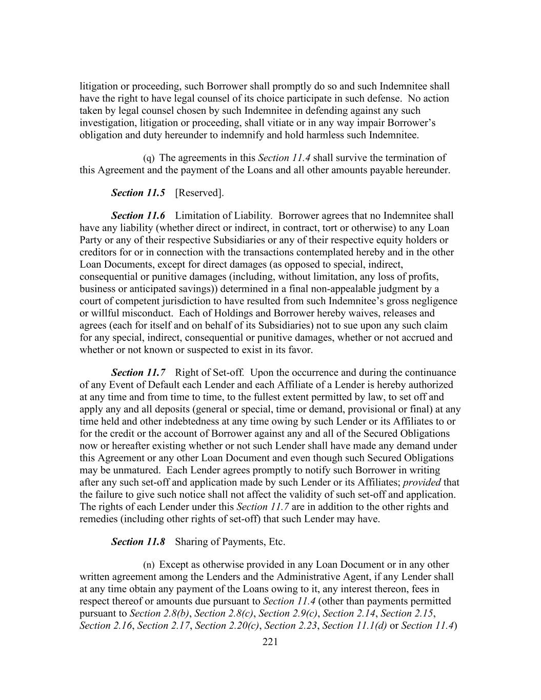 221 litigation or proceeding, such Borrower shall promptly do so and such Indemnitee shall have the right to have legal counsel of its choice participate in such defense. No action taken by legal counsel chosen by such Indemnitee in defending against any such investigation, litigation or proceeding, shall vitiate or in any way impair Borrower’s obligation and duty hereunder to indemnify and hold harmless such Indemnitee. (q) The agreements in this Section 11.4 shall survive the termination of this Agreement and the payment of the Loans and all other amounts payable hereunder. Section 11.5 [Reserved]. Section 11.6 Limitation of Liability. Borrower agrees that no Indemnitee shall have any liability (whether direct or indirect, in contract, tort or otherwise) to any Loan Party or any of their respective Subsidiaries or any of their respective equity holders or creditors for or in connection with the transactions contemplated hereby and in the other Loan Documents, except for direct damages (as opposed to special, indirect, consequential or punitive damages (including, without limitation, any loss of profits, business or anticipated savings)) determined in a final non-appealable judgment by a court of competent jurisdiction to have resulted from such Indemnitee’s gross negligence or willful misconduct. Each of Holdings and Borrower hereby waives, releases and agrees (each for itself and on behalf of its Subsidiaries) not to sue upon any such claim for any special, indirect, consequential or punitive damages, whether or not accrued and whether or not known or suspected to exist in its favor. Section 11.7 Right of Set-off. Upon the occurrence and during the continuance of any Event of Default each Lender and each Affiliate of a Lender is hereby authorized at any time and from time to time, to the fullest extent permitted by law, to set off and apply any and all deposits (general or special, time or demand, provisional or final) at any time held and other indebtedness at any time owing by such Lender or its Affiliates to or for the credit or the account of Borrower against any and all of the Secured Obligations now or hereafter existing whether or not such Lender shall have made any demand under this Agreement or any other Loan Document and even though such Secured Obligations may be unmatured. Each Lender agrees promptly to notify such Borrower in writing after any such set-off and application made by such Lender or its Affiliates; provided that the failure to give such notice shall not affect the validity of such set-off and application. The rights of each Lender under this Section 11.7 are in addition to the other rights and remedies (including other rights of set-off) that such Lender may have. Section 11.8 Sharing of Payments, Etc. (n) Except as otherwise provided in any Loan Document or in any other written agreement among the Lenders and the Administrative Agent, if any Lender shall at any time obtain any payment of the Loans owing to it, any interest thereon, fees in respect thereof or amounts due pursuant to Section 11.4 (other than payments permitted pursuant to Section 2.8(b), Section 2.8(c), Section 2.9(c), Section 2.14, Section 2.15, Section 2.16, Section 2.17, Section 2.20(c), Section 2.23, Section 11.1(d) or Section 11.4)