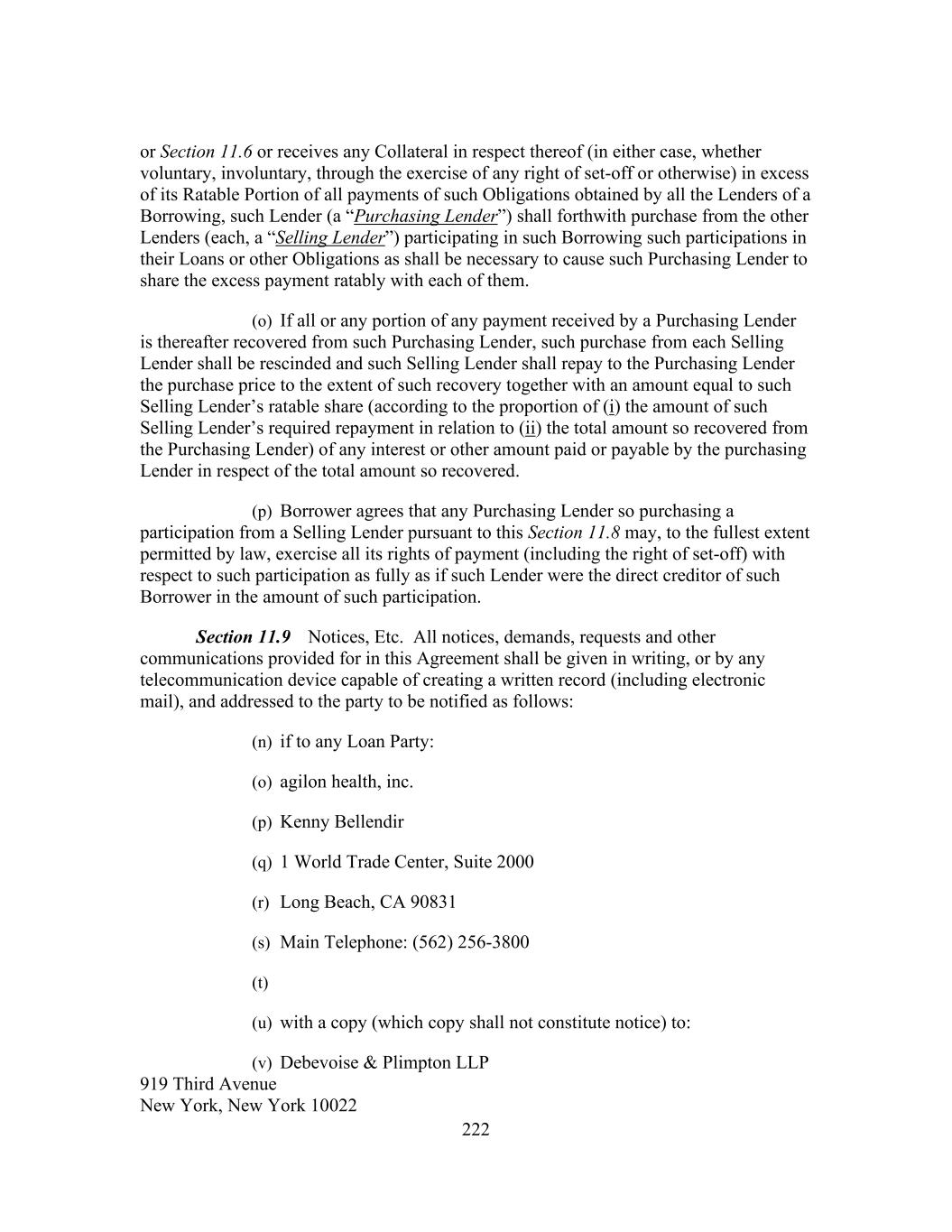 222 or Section 11.6 or receives any Collateral in respect thereof (in either case, whether voluntary, involuntary, through the exercise of any right of set-off or otherwise) in excess of its Ratable Portion of all payments of such Obligations obtained by all the Lenders of a Borrowing, such Lender (a “Purchasing Lender”) shall forthwith purchase from the other Lenders (each, a “Selling Lender”) participating in such Borrowing such participations in their Loans or other Obligations as shall be necessary to cause such Purchasing Lender to share the excess payment ratably with each of them. (o) If all or any portion of any payment received by a Purchasing Lender is thereafter recovered from such Purchasing Lender, such purchase from each Selling Lender shall be rescinded and such Selling Lender shall repay to the Purchasing Lender the purchase price to the extent of such recovery together with an amount equal to such Selling Lender’s ratable share (according to the proportion of (i) the amount of such Selling Lender’s required repayment in relation to (ii) the total amount so recovered from the Purchasing Lender) of any interest or other amount paid or payable by the purchasing Lender in respect of the total amount so recovered. (p) Borrower agrees that any Purchasing Lender so purchasing a participation from a Selling Lender pursuant to this Section 11.8 may, to the fullest extent permitted by law, exercise all its rights of payment (including the right of set-off) with respect to such participation as fully as if such Lender were the direct creditor of such Borrower in the amount of such participation. Section 11.9 Notices, Etc. All notices, demands, requests and other communications provided for in this Agreement shall be given in writing, or by any telecommunication device capable of creating a written record (including electronic mail), and addressed to the party to be notified as follows: (n) if to any Loan Party: (o) agilon health, inc. (p) Kenny Bellendir (q) 1 World Trade Center, Suite 2000 (r) Long Beach, CA 90831 (s) Main Telephone: (562) 256-3800 (t) (u) with a copy (which copy shall not constitute notice) to: (v) Debevoise & Plimpton LLP 919 Third Avenue New York, New York 10022