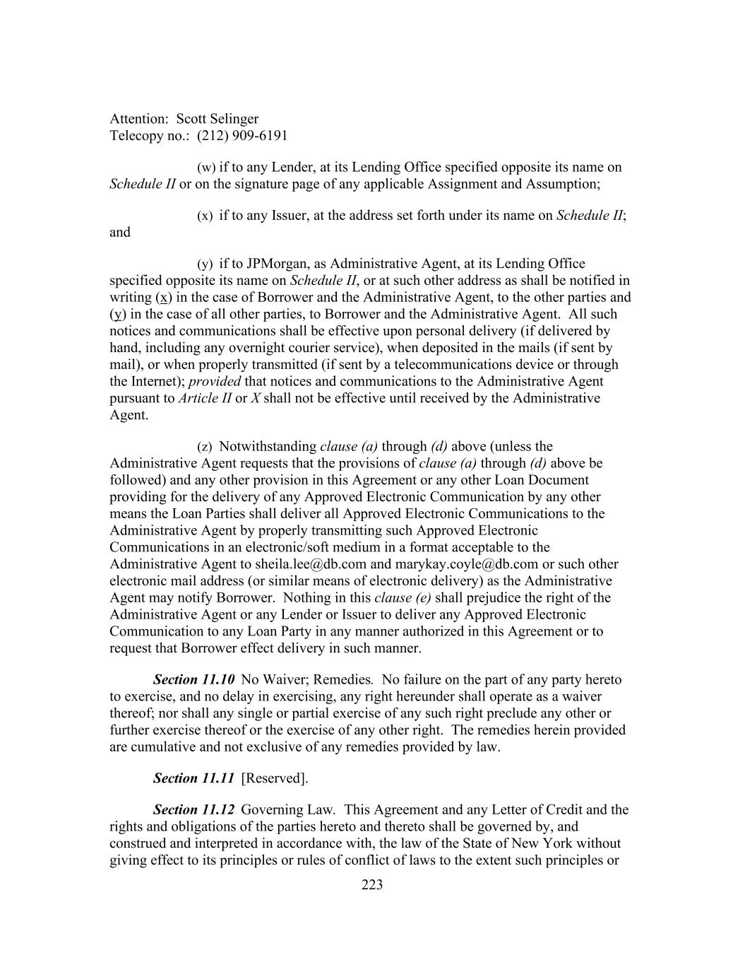 223 Attention: Scott Selinger Telecopy no.: (212) 909-6191 (w) if to any Lender, at its Lending Office specified opposite its name on Schedule II or on the signature page of any applicable Assignment and Assumption; (x) if to any Issuer, at the address set forth under its name on Schedule II; and (y) if to JPMorgan, as Administrative Agent, at its Lending Office specified opposite its name on Schedule II, or at such other address as shall be notified in writing (x) in the case of Borrower and the Administrative Agent, to the other parties and (y) in the case of all other parties, to Borrower and the Administrative Agent. All such notices and communications shall be effective upon personal delivery (if delivered by hand, including any overnight courier service), when deposited in the mails (if sent by mail), or when properly transmitted (if sent by a telecommunications device or through the Internet); provided that notices and communications to the Administrative Agent pursuant to Article II or X shall not be effective until received by the Administrative Agent. (z) Notwithstanding clause (a) through (d) above (unless the Administrative Agent requests that the provisions of clause (a) through (d) above be followed) and any other provision in this Agreement or any other Loan Document providing for the delivery of any Approved Electronic Communication by any other means the Loan Parties shall deliver all Approved Electronic Communications to the Administrative Agent by properly transmitting such Approved Electronic Communications in an electronic/soft medium in a format acceptable to the Administrative Agent to sheila.lee@db.com and marykay.coyle@db.com or such other electronic mail address (or similar means of electronic delivery) as the Administrative Agent may notify Borrower. Nothing in this clause (e) shall prejudice the right of the Administrative Agent or any Lender or Issuer to deliver any Approved Electronic Communication to any Loan Party in any manner authorized in this Agreement or to request that Borrower effect delivery in such manner. Section 11.10 No Waiver; Remedies. No failure on the part of any party hereto to exercise, and no delay in exercising, any right hereunder shall operate as a waiver thereof; nor shall any single or partial exercise of any such right preclude any other or further exercise thereof or the exercise of any other right. The remedies herein provided are cumulative and not exclusive of any remedies provided by law. Section 11.11 [Reserved]. Section 11.12 Governing Law. This Agreement and any Letter of Credit and the rights and obligations of the parties hereto and thereto shall be governed by, and construed and interpreted in accordance with, the law of the State of New York without giving effect to its principles or rules of conflict of laws to the extent such principles or