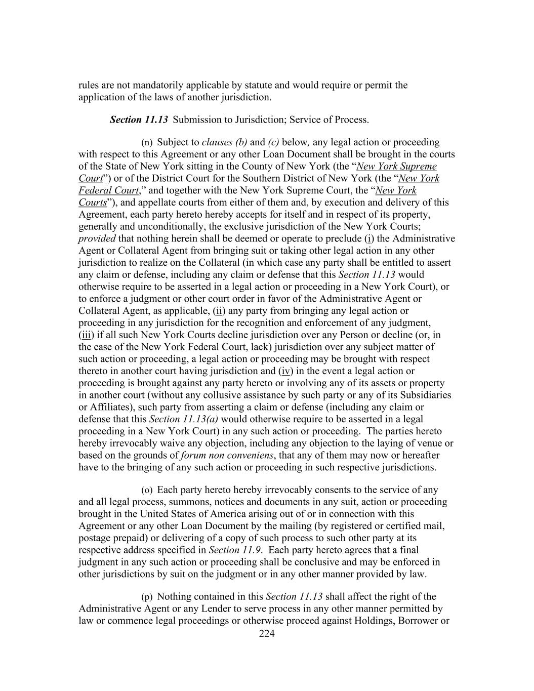 224 rules are not mandatorily applicable by statute and would require or permit the application of the laws of another jurisdiction. Section 11.13 Submission to Jurisdiction; Service of Process. (n) Subject to clauses (b) and (c) below, any legal action or proceeding with respect to this Agreement or any other Loan Document shall be brought in the courts of the State of New York sitting in the County of New York (the “New York Supreme Court”) or of the District Court for the Southern District of New York (the “New York Federal Court,” and together with the New York Supreme Court, the “New York Courts”), and appellate courts from either of them and, by execution and delivery of this Agreement, each party hereto hereby accepts for itself and in respect of its property, generally and unconditionally, the exclusive jurisdiction of the New York Courts; provided that nothing herein shall be deemed or operate to preclude (i) the Administrative Agent or Collateral Agent from bringing suit or taking other legal action in any other jurisdiction to realize on the Collateral (in which case any party shall be entitled to assert any claim or defense, including any claim or defense that this Section 11.13 would otherwise require to be asserted in a legal action or proceeding in a New York Court), or to enforce a judgment or other court order in favor of the Administrative Agent or Collateral Agent, as applicable, (ii) any party from bringing any legal action or proceeding in any jurisdiction for the recognition and enforcement of any judgment, (iii) if all such New York Courts decline jurisdiction over any Person or decline (or, in the case of the New York Federal Court, lack) jurisdiction over any subject matter of such action or proceeding, a legal action or proceeding may be brought with respect thereto in another court having jurisdiction and (iv) in the event a legal action or proceeding is brought against any party hereto or involving any of its assets or property in another court (without any collusive assistance by such party or any of its Subsidiaries or Affiliates), such party from asserting a claim or defense (including any claim or defense that this Section 11.13(a) would otherwise require to be asserted in a legal proceeding in a New York Court) in any such action or proceeding. The parties hereto hereby irrevocably waive any objection, including any objection to the laying of venue or based on the grounds of forum non conveniens, that any of them may now or hereafter have to the bringing of any such action or proceeding in such respective jurisdictions. (o) Each party hereto hereby irrevocably consents to the service of any and all legal process, summons, notices and documents in any suit, action or proceeding brought in the United States of America arising out of or in connection with this Agreement or any other Loan Document by the mailing (by registered or certified mail, postage prepaid) or delivering of a copy of such process to such other party at its respective address specified in Section 11.9. Each party hereto agrees that a final judgment in any such action or proceeding shall be conclusive and may be enforced in other jurisdictions by suit on the judgment or in any other manner provided by law. (p) Nothing contained in this Section 11.13 shall affect the right of the Administrative Agent or any Lender to serve process in any other manner permitted by law or commence legal proceedings or otherwise proceed against Holdings, Borrower or