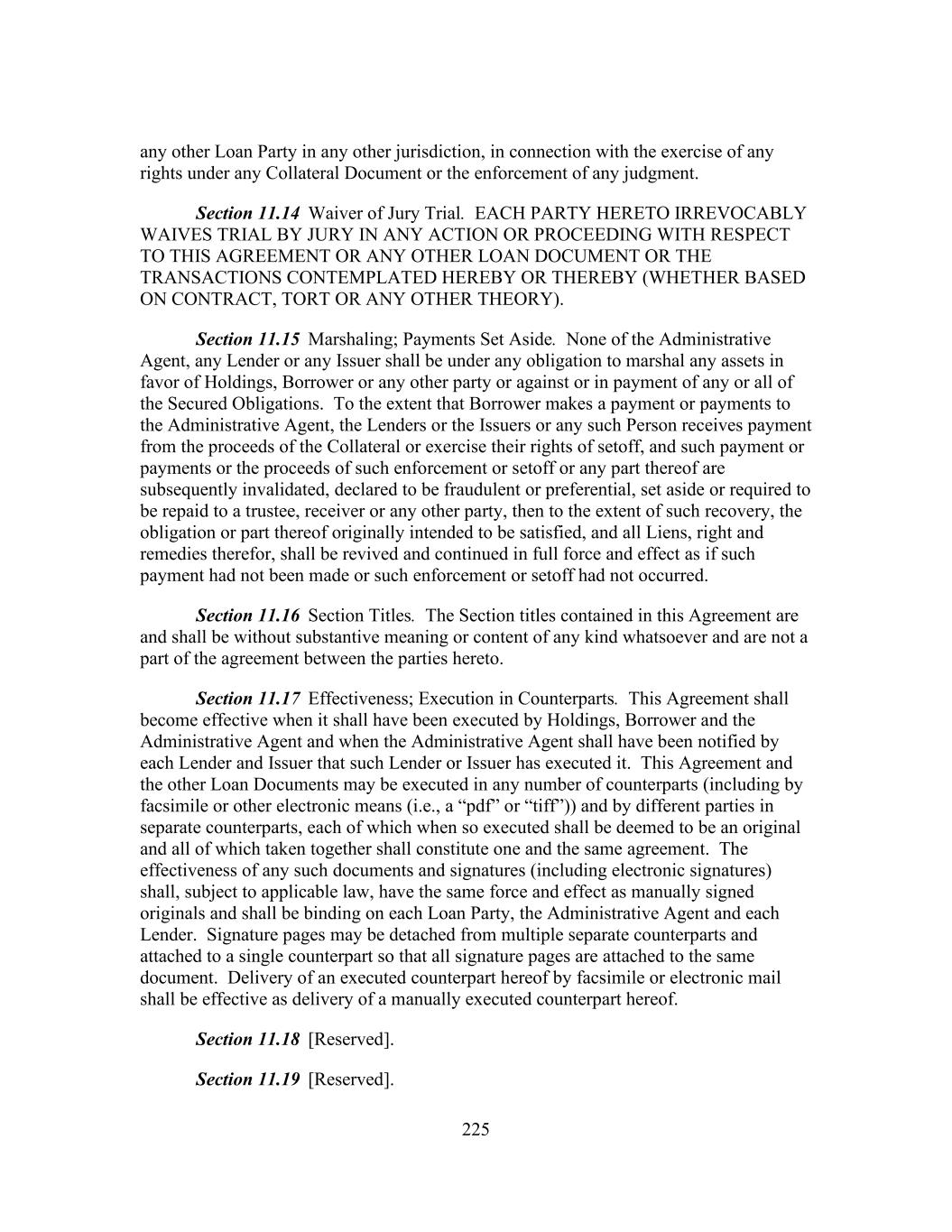 225 any other Loan Party in any other jurisdiction, in connection with the exercise of any rights under any Collateral Document or the enforcement of any judgment. Section 11.14 Waiver of Jury Trial. EACH PARTY HERETO IRREVOCABLY WAIVES TRIAL BY JURY IN ANY ACTION OR PROCEEDING WITH RESPECT TO THIS AGREEMENT OR ANY OTHER LOAN DOCUMENT OR THE TRANSACTIONS CONTEMPLATED HEREBY OR THEREBY (WHETHER BASED ON CONTRACT, TORT OR ANY OTHER THEORY). Section 11.15 Marshaling; Payments Set Aside. None of the Administrative Agent, any Lender or any Issuer shall be under any obligation to marshal any assets in favor of Holdings, Borrower or any other party or against or in payment of any or all of the Secured Obligations. To the extent that Borrower makes a payment or payments to the Administrative Agent, the Lenders or the Issuers or any such Person receives payment from the proceeds of the Collateral or exercise their rights of setoff, and such payment or payments or the proceeds of such enforcement or setoff or any part thereof are subsequently invalidated, declared to be fraudulent or preferential, set aside or required to be repaid to a trustee, receiver or any other party, then to the extent of such recovery, the obligation or part thereof originally intended to be satisfied, and all Liens, right and remedies therefor, shall be revived and continued in full force and effect as if such payment had not been made or such enforcement or setoff had not occurred. Section 11.16 Section Titles. The Section titles contained in this Agreement are and shall be without substantive meaning or content of any kind whatsoever and are not a part of the agreement between the parties hereto. Section 11.17 Effectiveness; Execution in Counterparts. This Agreement shall become effective when it shall have been executed by Holdings, Borrower and the Administrative Agent and when the Administrative Agent shall have been notified by each Lender and Issuer that such Lender or Issuer has executed it. This Agreement and the other Loan Documents may be executed in any number of counterparts (including by facsimile or other electronic means (i.e., a “pdf” or “tiff”)) and by different parties in separate counterparts, each of which when so executed shall be deemed to be an original and all of which taken together shall constitute one and the same agreement. The effectiveness of any such documents and signatures (including electronic signatures) shall, subject to applicable law, have the same force and effect as manually signed originals and shall be binding on each Loan Party, the Administrative Agent and each Lender. Signature pages may be detached from multiple separate counterparts and attached to a single counterpart so that all signature pages are attached to the same document. Delivery of an executed counterpart hereof by facsimile or electronic mail shall be effective as delivery of a manually executed counterpart hereof. Section 11.18 [Reserved]. Section 11.19 [Reserved].