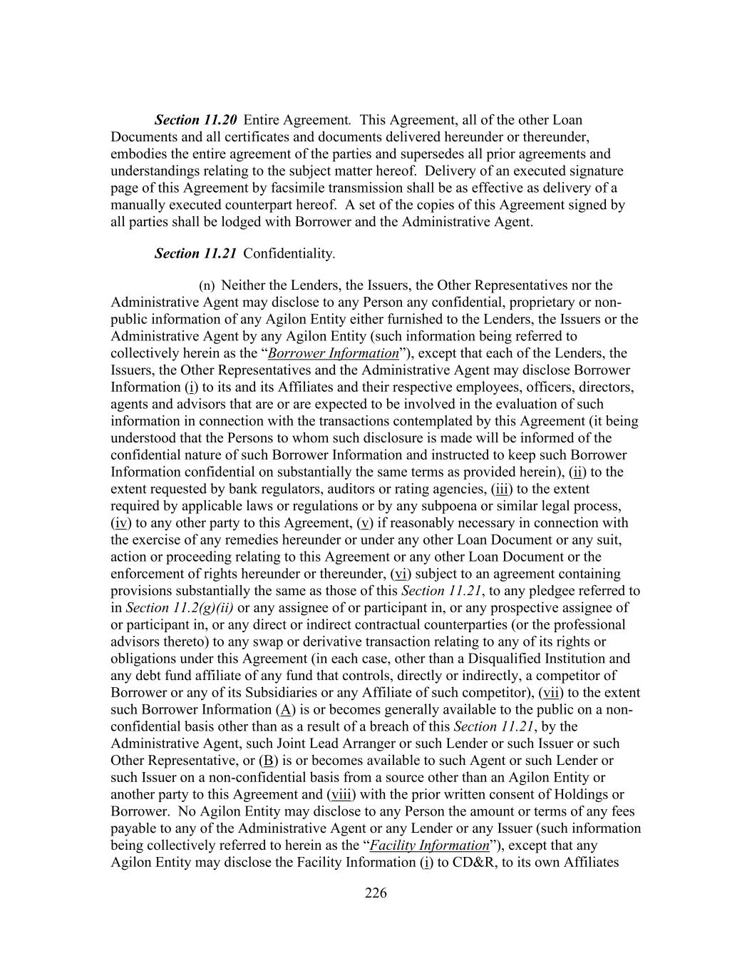 226 Section 11.20 Entire Agreement. This Agreement, all of the other Loan Documents and all certificates and documents delivered hereunder or thereunder, embodies the entire agreement of the parties and supersedes all prior agreements and understandings relating to the subject matter hereof. Delivery of an executed signature page of this Agreement by facsimile transmission shall be as effective as delivery of a manually executed counterpart hereof. A set of the copies of this Agreement signed by all parties shall be lodged with Borrower and the Administrative Agent. Section 11.21 Confidentiality. (n) Neither the Lenders, the Issuers, the Other Representatives nor the Administrative Agent may disclose to any Person any confidential, proprietary or non- public information of any Agilon Entity either furnished to the Lenders, the Issuers or the Administrative Agent by any Agilon Entity (such information being referred to collectively herein as the “Borrower Information”), except that each of the Lenders, the Issuers, the Other Representatives and the Administrative Agent may disclose Borrower Information (i) to its and its Affiliates and their respective employees, officers, directors, agents and advisors that are or are expected to be involved in the evaluation of such information in connection with the transactions contemplated by this Agreement (it being understood that the Persons to whom such disclosure is made will be informed of the confidential nature of such Borrower Information and instructed to keep such Borrower Information confidential on substantially the same terms as provided herein), (ii) to the extent requested by bank regulators, auditors or rating agencies, (iii) to the extent required by applicable laws or regulations or by any subpoena or similar legal process, (iv) to any other party to this Agreement, (v) if reasonably necessary in connection with the exercise of any remedies hereunder or under any other Loan Document or any suit, action or proceeding relating to this Agreement or any other Loan Document or the enforcement of rights hereunder or thereunder, (vi) subject to an agreement containing provisions substantially the same as those of this Section 11.21, to any pledgee referred to in Section 11.2(g)(ii) or any assignee of or participant in, or any prospective assignee of or participant in, or any direct or indirect contractual counterparties (or the professional advisors thereto) to any swap or derivative transaction relating to any of its rights or obligations under this Agreement (in each case, other than a Disqualified Institution and any debt fund affiliate of any fund that controls, directly or indirectly, a competitor of Borrower or any of its Subsidiaries or any Affiliate of such competitor), (vii) to the extent such Borrower Information (A) is or becomes generally available to the public on a non- confidential basis other than as a result of a breach of this Section 11.21, by the Administrative Agent, such Joint Lead Arranger or such Lender or such Issuer or such Other Representative, or (B) is or becomes available to such Agent or such Lender or such Issuer on a non-confidential basis from a source other than an Agilon Entity or another party to this Agreement and (viii) with the prior written consent of Holdings or Borrower. No Agilon Entity may disclose to any Person the amount or terms of any fees payable to any of the Administrative Agent or any Lender or any Issuer (such information being collectively referred to herein as the “Facility Information”), except that any Agilon Entity may disclose the Facility Information (i) to CD&R, to its own Affiliates