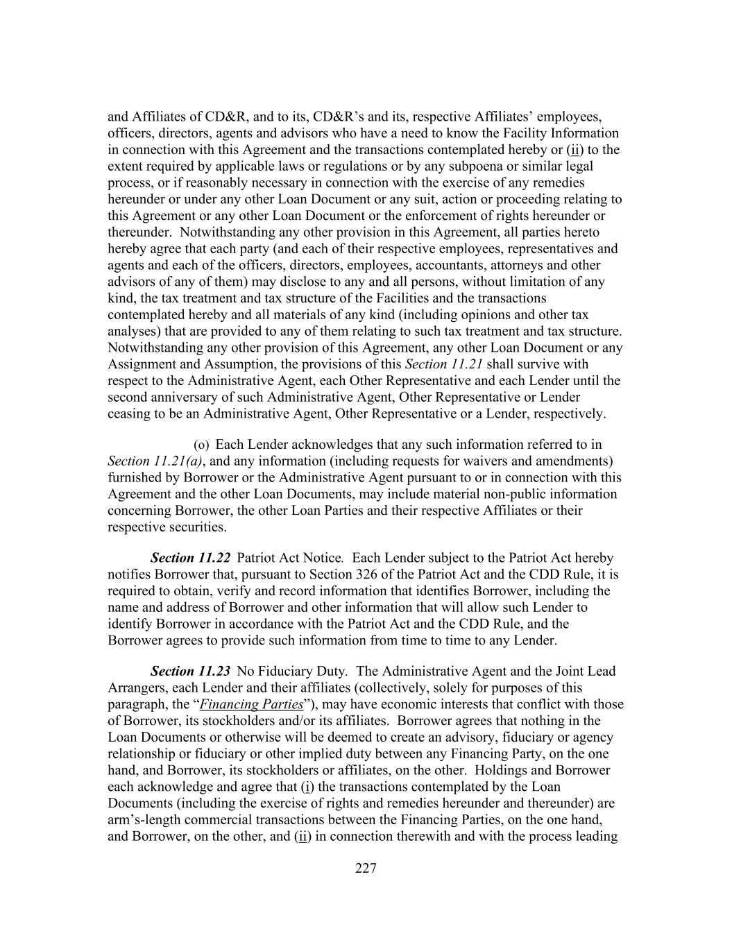 227 and Affiliates of CD&R, and to its, CD&R’s and its, respective Affiliates’ employees, officers, directors, agents and advisors who have a need to know the Facility Information in connection with this Agreement and the transactions contemplated hereby or (ii) to the extent required by applicable laws or regulations or by any subpoena or similar legal process, or if reasonably necessary in connection with the exercise of any remedies hereunder or under any other Loan Document or any suit, action or proceeding relating to this Agreement or any other Loan Document or the enforcement of rights hereunder or thereunder. Notwithstanding any other provision in this Agreement, all parties hereto hereby agree that each party (and each of their respective employees, representatives and agents and each of the officers, directors, employees, accountants, attorneys and other advisors of any of them) may disclose to any and all persons, without limitation of any kind, the tax treatment and tax structure of the Facilities and the transactions contemplated hereby and all materials of any kind (including opinions and other tax analyses) that are provided to any of them relating to such tax treatment and tax structure. Notwithstanding any other provision of this Agreement, any other Loan Document or any Assignment and Assumption, the provisions of this Section 11.21 shall survive with respect to the Administrative Agent, each Other Representative and each Lender until the second anniversary of such Administrative Agent, Other Representative or Lender ceasing to be an Administrative Agent, Other Representative or a Lender, respectively. (o) Each Lender acknowledges that any such information referred to in Section 11.21(a), and any information (including requests for waivers and amendments) furnished by Borrower or the Administrative Agent pursuant to or in connection with this Agreement and the other Loan Documents, may include material non-public information concerning Borrower, the other Loan Parties and their respective Affiliates or their respective securities. Section 11.22 Patriot Act Notice. Each Lender subject to the Patriot Act hereby notifies Borrower that, pursuant to Section 326 of the Patriot Act and the CDD Rule, it is required to obtain, verify and record information that identifies Borrower, including the name and address of Borrower and other information that will allow such Lender to identify Borrower in accordance with the Patriot Act and the CDD Rule, and the Borrower agrees to provide such information from time to time to any Lender. Section 11.23 No Fiduciary Duty. The Administrative Agent and the Joint Lead Arrangers, each Lender and their affiliates (collectively, solely for purposes of this paragraph, the “Financing Parties”), may have economic interests that conflict with those of Borrower, its stockholders and/or its affiliates. Borrower agrees that nothing in the Loan Documents or otherwise will be deemed to create an advisory, fiduciary or agency relationship or fiduciary or other implied duty between any Financing Party, on the one hand, and Borrower, its stockholders or affiliates, on the other. Holdings and Borrower each acknowledge and agree that (i) the transactions contemplated by the Loan Documents (including the exercise of rights and remedies hereunder and thereunder) are arm’s-length commercial transactions between the Financing Parties, on the one hand, and Borrower, on the other, and (ii) in connection therewith and with the process leading