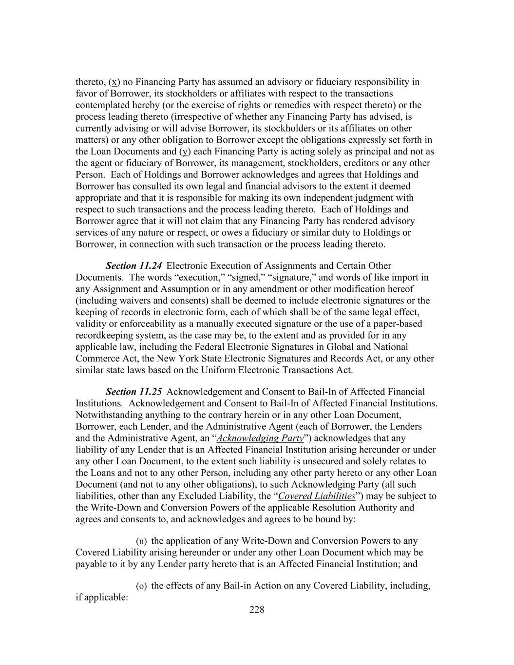 228 thereto, (x) no Financing Party has assumed an advisory or fiduciary responsibility in favor of Borrower, its stockholders or affiliates with respect to the transactions contemplated hereby (or the exercise of rights or remedies with respect thereto) or the process leading thereto (irrespective of whether any Financing Party has advised, is currently advising or will advise Borrower, its stockholders or its affiliates on other matters) or any other obligation to Borrower except the obligations expressly set forth in the Loan Documents and (y) each Financing Party is acting solely as principal and not as the agent or fiduciary of Borrower, its management, stockholders, creditors or any other Person. Each of Holdings and Borrower acknowledges and agrees that Holdings and Borrower has consulted its own legal and financial advisors to the extent it deemed appropriate and that it is responsible for making its own independent judgment with respect to such transactions and the process leading thereto. Each of Holdings and Borrower agree that it will not claim that any Financing Party has rendered advisory services of any nature or respect, or owes a fiduciary or similar duty to Holdings or Borrower, in connection with such transaction or the process leading thereto. Section 11.24 Electronic Execution of Assignments and Certain Other Documents. The words “execution,” “signed,” “signature,” and words of like import in any Assignment and Assumption or in any amendment or other modification hereof (including waivers and consents) shall be deemed to include electronic signatures or the keeping of records in electronic form, each of which shall be of the same legal effect, validity or enforceability as a manually executed signature or the use of a paper-based recordkeeping system, as the case may be, to the extent and as provided for in any applicable law, including the Federal Electronic Signatures in Global and National Commerce Act, the New York State Electronic Signatures and Records Act, or any other similar state laws based on the Uniform Electronic Transactions Act. Section 11.25 Acknowledgement and Consent to Bail-In of Affected Financial Institutions. Acknowledgement and Consent to Bail-In of Affected Financial Institutions. Notwithstanding anything to the contrary herein or in any other Loan Document, Borrower, each Lender, and the Administrative Agent (each of Borrower, the Lenders and the Administrative Agent, an “Acknowledging Party”) acknowledges that any liability of any Lender that is an Affected Financial Institution arising hereunder or under any other Loan Document, to the extent such liability is unsecured and solely relates to the Loans and not to any other Person, including any other party hereto or any other Loan Document (and not to any other obligations), to such Acknowledging Party (all such liabilities, other than any Excluded Liability, the “Covered Liabilities”) may be subject to the Write-Down and Conversion Powers of the applicable Resolution Authority and agrees and consents to, and acknowledges and agrees to be bound by: (n) the application of any Write-Down and Conversion Powers to any Covered Liability arising hereunder or under any other Loan Document which may be payable to it by any Lender party hereto that is an Affected Financial Institution; and (o) the effects of any Bail-in Action on any Covered Liability, including, if applicable: