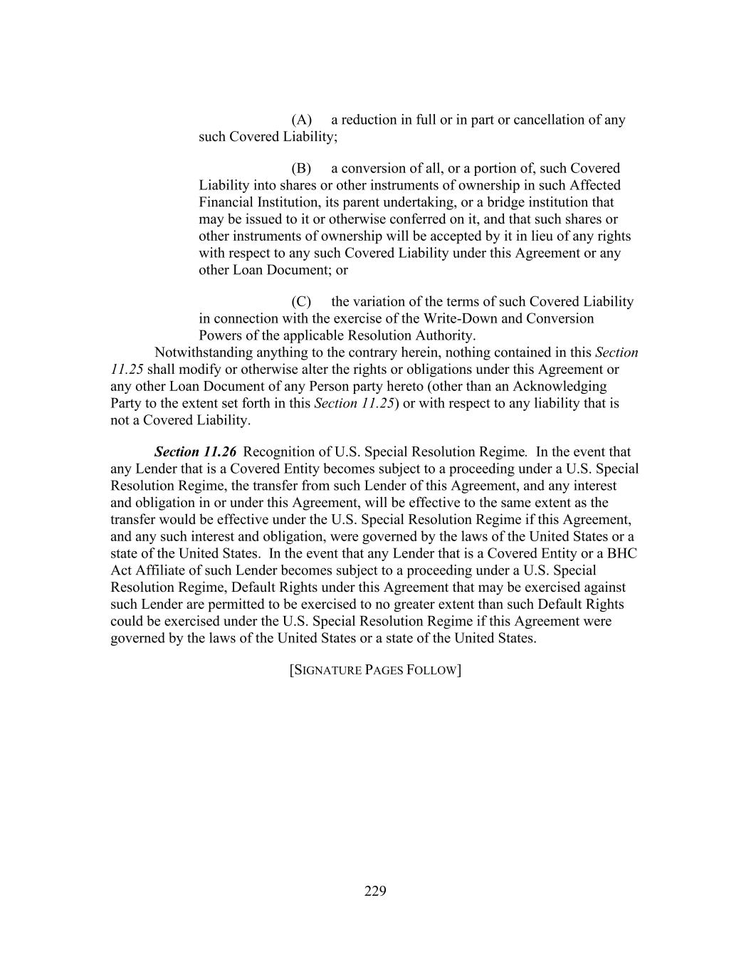229 (A) a reduction in full or in part or cancellation of any such Covered Liability; (B) a conversion of all, or a portion of, such Covered Liability into shares or other instruments of ownership in such Affected Financial Institution, its parent undertaking, or a bridge institution that may be issued to it or otherwise conferred on it, and that such shares or other instruments of ownership will be accepted by it in lieu of any rights with respect to any such Covered Liability under this Agreement or any other Loan Document; or (C) the variation of the terms of such Covered Liability in connection with the exercise of the Write-Down and Conversion Powers of the applicable Resolution Authority. Notwithstanding anything to the contrary herein, nothing contained in this Section 11.25 shall modify or otherwise alter the rights or obligations under this Agreement or any other Loan Document of any Person party hereto (other than an Acknowledging Party to the extent set forth in this Section 11.25) or with respect to any liability that is not a Covered Liability. Section 11.26 Recognition of U.S. Special Resolution Regime. In the event that any Lender that is a Covered Entity becomes subject to a proceeding under a U.S. Special Resolution Regime, the transfer from such Lender of this Agreement, and any interest and obligation in or under this Agreement, will be effective to the same extent as the transfer would be effective under the U.S. Special Resolution Regime if this Agreement, and any such interest and obligation, were governed by the laws of the United States or a state of the United States. In the event that any Lender that is a Covered Entity or a BHC Act Affiliate of such Lender becomes subject to a proceeding under a U.S. Special Resolution Regime, Default Rights under this Agreement that may be exercised against such Lender are permitted to be exercised to no greater extent than such Default Rights could be exercised under the U.S. Special Resolution Regime if this Agreement were governed by the laws of the United States or a state of the United States. [SIGNATURE PAGES FOLLOW]
