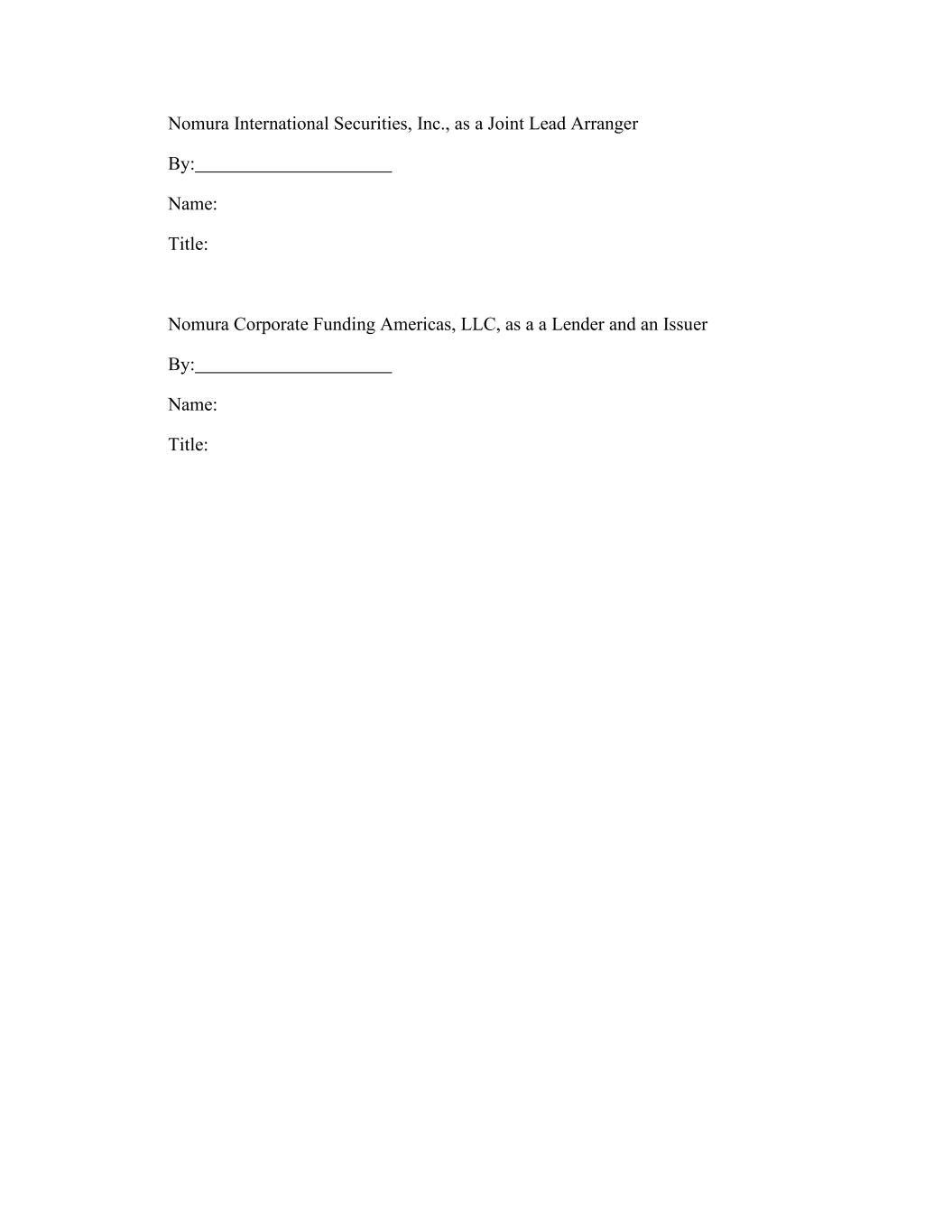 Nomura International Securities, Inc., as a Joint Lead Arranger By: Name: Title: Nomura Corporate Funding Americas, LLC, as a a Lender and an Issuer By: Name: Title: