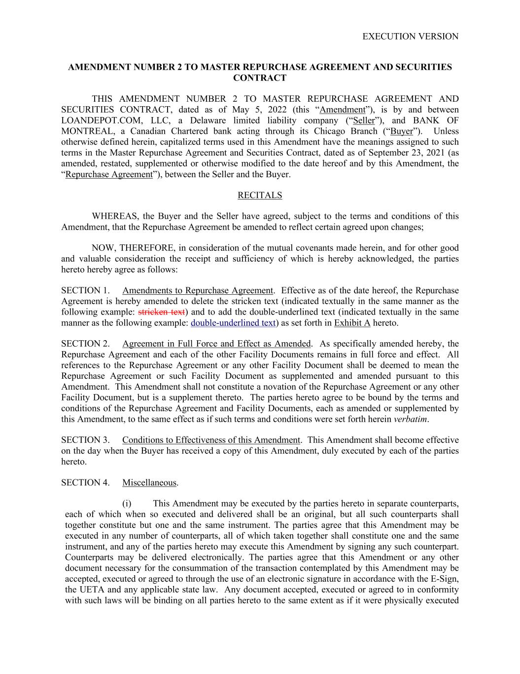 EXECUTION VERSION AMENDMENT NUMBER 2 TO MASTER REPURCHASE AGREEMENT AND SECURITIES CONTRACT THIS AMENDMENT NUMBER 2 TO MASTER REPURCHASE AGREEMENT AND SECURITIES CONTRACT, dated as of May 5, 2022 (this “Amendment”), is by and between LOANDEPOT.COM, LLC, a Delaware limited liability company (“Seller”), and BANK OF MONTREAL, a Canadian Chartered bank acting through its Chicago Branch (“Buyer”). Unless otherwise defined herein, capitalized terms used in this Amendment have the meanings assigned to such terms in the Master Repurchase Agreement and Securities Contract, dated as of September 23, 2021 (as amended, restated, supplemented or otherwise modified to the date hereof and by this Amendment, the “Repurchase Agreement”), between the Seller and the Buyer. RECITALS WHEREAS, the Buyer and the Seller have agreed, subject to the terms and conditions of this Amendment, that the Repurchase Agreement be amended to reflect certain agreed upon changes; NOW, THEREFORE, in consideration of the mutual covenants made herein, and for other good and valuable consideration the receipt and sufficiency of which is hereby acknowledged, the parties hereto hereby agree as follows: SECTION 1. Amendments to Repurchase Agreement. Effective as of the date hereof, the Repurchase Agreement is hereby amended to delete the stricken text (indicated textually in the same manner as the following example: stricken text) and to add the double-underlined text (indicated textually in the same manner as the following example: double-underlined text) as set forth in Exhibit A hereto. SECTION 2. Agreement in Full Force and Effect as Amended. As specifically amended hereby, the Repurchase Agreement and each of the other Facility Documents remains in full force and effect. All references to the Repurchase Agreement or any other Facility Document shall be deemed to mean the Repurchase Agreement or such Facility Document as supplemented and amended pursuant to this Amendment. This Amendment shall not constitute a novation of the Repurchase Agreement or any other Facility Document, but is a supplement thereto. The parties hereto agree to be bound by the terms and conditions of the Repurchase Agreement and Facility Documents, each as amended or supplemented by this Amendment, to the same effect as if such terms and conditions were set forth herein verbatim. SECTION 3. Conditions to Effectiveness of this Amendment. This Amendment shall become effective on the day when the Buyer has received a copy of this Amendment, duly executed by each of the parties hereto. SECTION 4. Miscellaneous. (i) This Amendment may be executed by the parties hereto in separate counterparts, each of which when so executed and delivered shall be an original, but all such counterparts shall together constitute but one and the same instrument. The parties agree that this Amendment may be executed in any number of counterparts, all of which taken together shall constitute one and the same instrument, and any of the parties hereto may execute this Amendment by signing any such counterpart. Counterparts may be delivered electronically. The parties agree that this Amendment or any other document necessary for the consummation of the transaction contemplated by this Amendment may be accepted, executed or agreed to through the use of an electronic signature in accordance with the E-Sign, the UETA and any applicable state law. Any document accepted, executed or agreed to in conformity with such laws will be binding on all parties hereto to the same extent as if it were physically executed