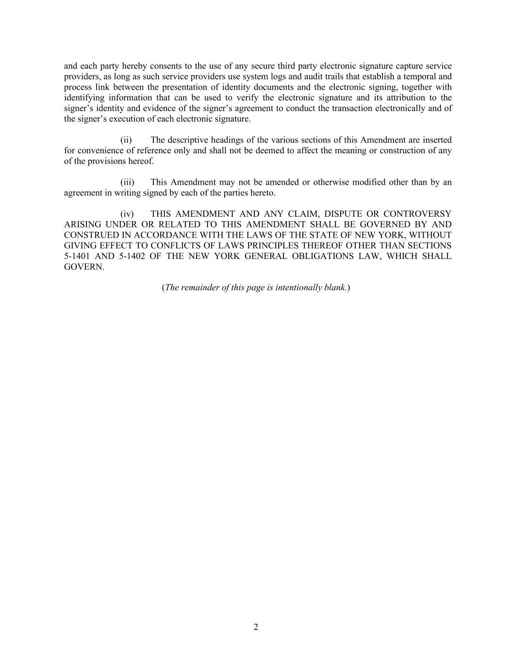 2 and each party hereby consents to the use of any secure third party electronic signature capture service providers, as long as such service providers use system logs and audit trails that establish a temporal and process link between the presentation of identity documents and the electronic signing, together with identifying information that can be used to verify the electronic signature and its attribution to the signer’s identity and evidence of the signer’s agreement to conduct the transaction electronically and of the signer’s execution of each electronic signature. (ii) The descriptive headings of the various sections of this Amendment are inserted for convenience of reference only and shall not be deemed to affect the meaning or construction of any of the provisions hereof. (iii) This Amendment may not be amended or otherwise modified other than by an agreement in writing signed by each of the parties hereto. (iv) THIS AMENDMENT AND ANY CLAIM, DISPUTE OR CONTROVERSY ARISING UNDER OR RELATED TO THIS AMENDMENT SHALL BE GOVERNED BY AND CONSTRUED IN ACCORDANCE WITH THE LAWS OF THE STATE OF NEW YORK, WITHOUT GIVING EFFECT TO CONFLICTS OF LAWS PRINCIPLES THEREOF OTHER THAN SECTIONS 5-1401 AND 5-1402 OF THE NEW YORK GENERAL OBLIGATIONS LAW, WHICH SHALL GOVERN. (The remainder of this page is intentionally blank.)