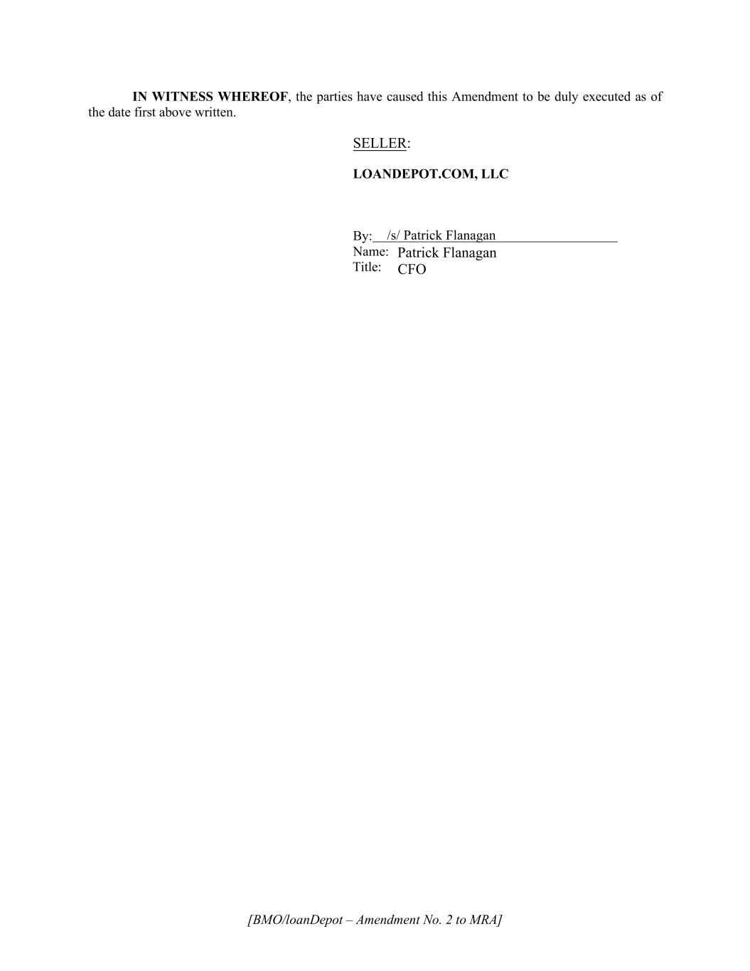 [BMO/loanDepot – Amendment No. 2 to MRA] IN WITNESS WHEREOF, the parties have caused this Amendment to be duly executed as of the date first above written. Name: Title: CFO Patrick Flanagan SELLER: LOANDEPOT.COM, LLC By: /s/ Patrick Flanagan