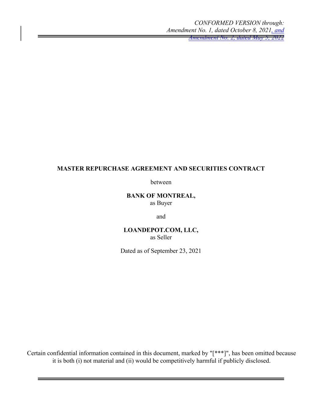 CONFORMED VERSION through: Amendment No. 1, dated October 8, 2021, and Amendment No. 2, dated May 5, 2022 MASTER REPURCHASE AGREEMENT AND SECURITIES CONTRACT between BANK OF MONTREAL, as Buyer and LOANDEPOT.COM, LLC, as Seller Dated as of September 23, 2021 Certain confidential information contained in this document, marked by "[***]", has been omitted because it is both (i) not material and (ii) would be competitively harmful if publicly disclosed.