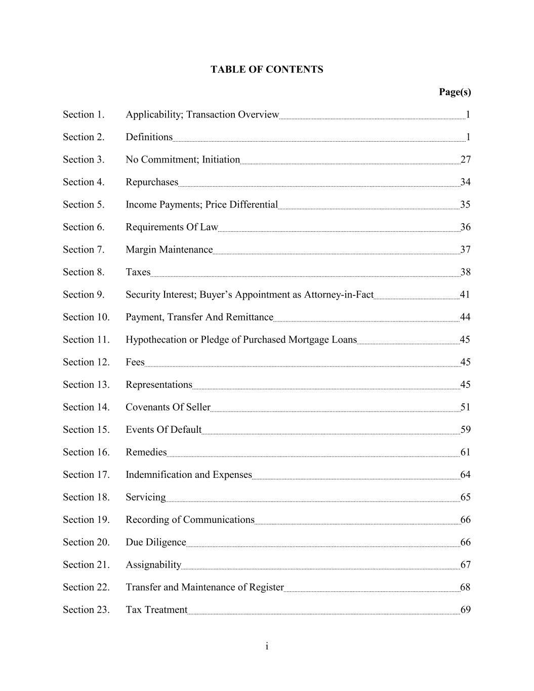 TABLE OF CONTENTS Page(s) Section 1. Applicability; Transaction Overview 1 Section 2. Definitions 1 Section 3. No Commitment; Initiation 27 Section 4. Repurchases 34 Section 5. Income Payments; Price Differential 35 Section 6. Requirements Of Law 36 Section 7. Margin Maintenance 37 Section 8. Taxes 38 Section 9. Security Interest; Buyer’s Appointment as Attorney-in-Fact 41 Section 10. Payment, Transfer And Remittance 44 Section 11. Hypothecation or Pledge of Purchased Mortgage Loans 45 Section 12. Fees 45 Section 13. Representations 45 Section 14. Covenants Of Seller 51 Section 15. Events Of Default 59 Section 16. Remedies 61 Section 17. Indemnification and Expenses 64 Section 18. Servicing 65 Section 19. Recording of Communications 66 Section 20. Due Diligence 66 Section 21. Assignability 67 Section 22. Transfer and Maintenance of Register 68 Section 23. Tax Treatment 69 i