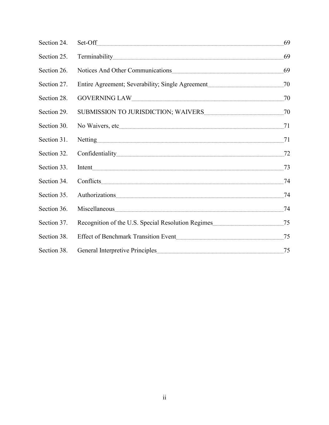 Section 24. Set-Off 69 Section 25. Terminability 69 Section 26. Notices And Other Communications 69 Section 27. Entire Agreement; Severability; Single Agreement 70 Section 28. GOVERNING LAW 70 Section 29. SUBMISSION TO JURISDICTION; WAIVERS 70 Section 30. No Waivers, etc 71 Section 31. Netting 71 Section 32. Confidentiality 72 Section 33. Intent 73 Section 34. Conflicts 74 Section 35. Authorizations 74 Section 36. Miscellaneous 74 Section 37. Recognition of the U.S. Special Resolution Regimes 75 Section 38. Effect of Benchmark Transition Event 75 Section 38. General Interpretive Principles 75 ii