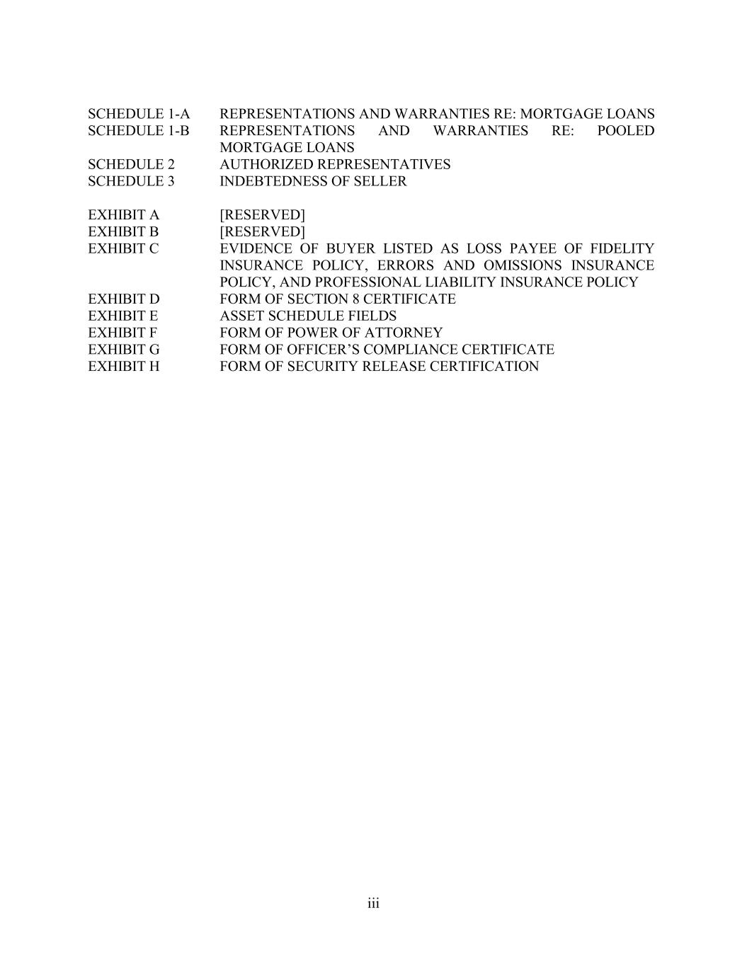 SCHEDULE 1-A REPRESENTATIONS AND WARRANTIES RE: MORTGAGE LOANS SCHEDULE 1-B REPRESENTATIONS AND WARRANTIES RE: POOLED MORTGAGE LOANS SCHEDULE 2 AUTHORIZED REPRESENTATIVES SCHEDULE 3 INDEBTEDNESS OF SELLER EXHIBIT A [RESERVED] EXHIBIT B [RESERVED] EXHIBIT C EVIDENCE OF BUYER LISTED AS LOSS PAYEE OF FIDELITY INSURANCE POLICY, ERRORS AND OMISSIONS INSURANCE POLICY, AND PROFESSIONAL LIABILITY INSURANCE POLICY EXHIBIT D FORM OF SECTION 8 CERTIFICATE EXHIBIT E ASSET SCHEDULE FIELDS EXHIBIT F FORM OF POWER OF ATTORNEY EXHIBIT G FORM OF OFFICER’S COMPLIANCE CERTIFICATE EXHIBIT H FORM OF SECURITY RELEASE CERTIFICATION iii