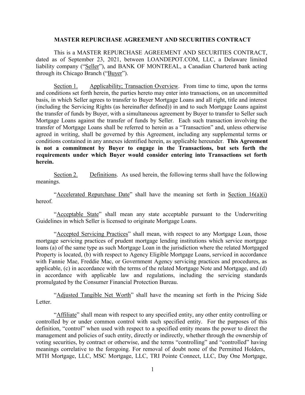 MASTER REPURCHASE AGREEMENT AND SECURITIES CONTRACT This is a MASTER REPURCHASE AGREEMENT AND SECURITIES CONTRACT, dated as of September 23, 2021, between LOANDEPOT.COM, LLC, a Delaware limited liability company (“Seller”), and BANK OF MONTREAL, a Canadian Chartered bank acting through its Chicago Branch (“Buyer”). Section 1. Applicability; Transaction Overview. From time to time, upon the terms and conditions set forth herein, the parties hereto may enter into transactions, on an uncommitted basis, in which Seller agrees to transfer to Buyer Mortgage Loans and all right, title and interest (including the Servicing Rights (as hereinafter defined)) in and to such Mortgage Loans against the transfer of funds by Buyer, with a simultaneous agreement by Buyer to transfer to Seller such Mortgage Loans against the transfer of funds by Seller. Each such transaction involving the transfer of Mortgage Loans shall be referred to herein as a “Transaction” and, unless otherwise agreed in writing, shall be governed by this Agreement, including any supplemental terms or conditions contained in any annexes identified herein, as applicable hereunder. This Agreement is not a commitment by Buyer to engage in the Transactions, but sets forth the requirements under which Buyer would consider entering into Transactions set forth herein. Section 2. Definitions. As used herein, the following terms shall have the following meanings. “Accelerated Repurchase Date” shall have the meaning set forth in Section 16(a)(i) hereof. “Acceptable State” shall mean any state acceptable pursuant to the Underwriting Guidelines in which Seller is licensed to originate Mortgage Loans. “Accepted Servicing Practices” shall mean, with respect to any Mortgage Loan, those mortgage servicing practices of prudent mortgage lending institutions which service mortgage loans (a) of the same type as such Mortgage Loan in the jurisdiction where the related Mortgaged Property is located, (b) with respect to Agency Eligible Mortgage Loans, serviced in accordance with Fannie Mae, Freddie Mac, or Government Agency servicing practices and procedures, as applicable, (c) in accordance with the terms of the related Mortgage Note and Mortgage, and (d) in accordance with applicable law and regulations, including the servicing standards promulgated by the Consumer Financial Protection Bureau. “Adjusted Tangible Net Worth” shall have the meaning set forth in the Pricing Side Letter. “Affiliate” shall mean with respect to any specified entity, any other entity controlling or controlled by or under common control with such specified entity. For the purposes of this definition, “control” when used with respect to a specified entity means the power to direct the management and policies of such entity, directly or indirectly, whether through the ownership of voting securities, by contract or otherwise, and the terms “controlling” and “controlled” having meanings correlative to the foregoing. For removal of doubt none of the Permitted Holders, MTH Mortgage, LLC, MSC Mortgage, LLC, TRI Pointe Connect, LLC, Day One Mortgage, 1