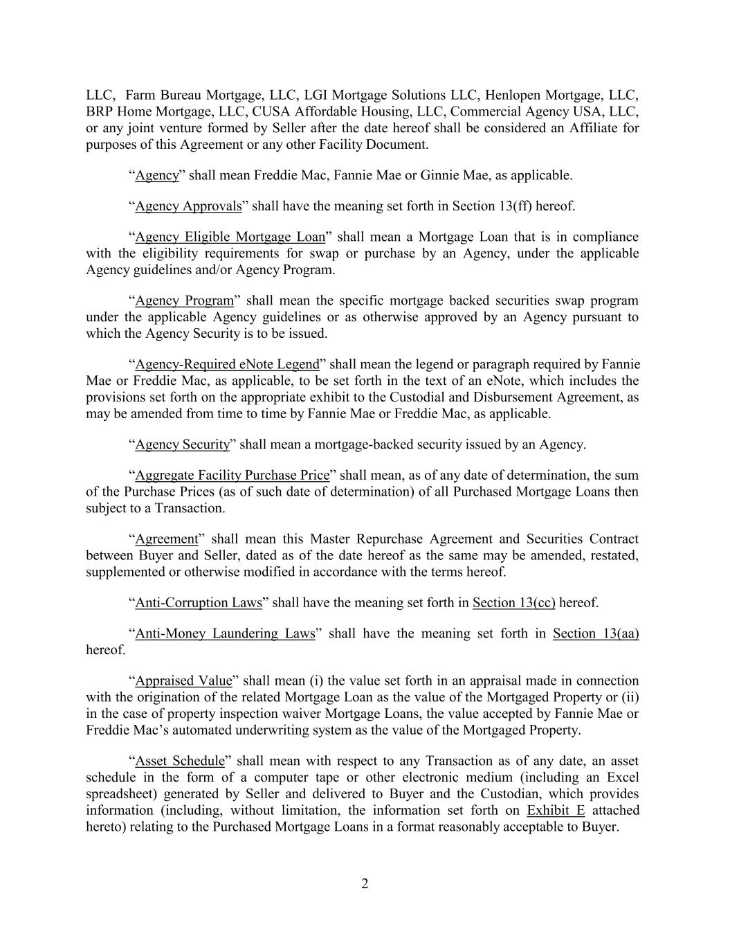 LLC, Farm Bureau Mortgage, LLC, LGI Mortgage Solutions LLC, Henlopen Mortgage, LLC, BRP Home Mortgage, LLC, CUSA Affordable Housing, LLC, Commercial Agency USA, LLC, or any joint venture formed by Seller after the date hereof shall be considered an Affiliate for purposes of this Agreement or any other Facility Document. “Agency” shall mean Freddie Mac, Fannie Mae or Ginnie Mae, as applicable. “Agency Approvals” shall have the meaning set forth in Section 13(ff) hereof. “Agency Eligible Mortgage Loan” shall mean a Mortgage Loan that is in compliance with the eligibility requirements for swap or purchase by an Agency, under the applicable Agency guidelines and/or Agency Program. “Agency Program” shall mean the specific mortgage backed securities swap program under the applicable Agency guidelines or as otherwise approved by an Agency pursuant to which the Agency Security is to be issued. “Agency-Required eNote Legend” shall mean the legend or paragraph required by Fannie Mae or Freddie Mac, as applicable, to be set forth in the text of an eNote, which includes the provisions set forth on the appropriate exhibit to the Custodial and Disbursement Agreement, as may be amended from time to time by Fannie Mae or Freddie Mac, as applicable. “Agency Security” shall mean a mortgage-backed security issued by an Agency. “Aggregate Facility Purchase Price” shall mean, as of any date of determination, the sum of the Purchase Prices (as of such date of determination) of all Purchased Mortgage Loans then subject to a Transaction. “Agreement” shall mean this Master Repurchase Agreement and Securities Contract between Buyer and Seller, dated as of the date hereof as the same may be amended, restated, supplemented or otherwise modified in accordance with the terms hereof. “Anti-Corruption Laws” shall have the meaning set forth in Section 13(cc) hereof. “Anti-Money Laundering Laws” shall have the meaning set forth in Section 13(aa) hereof. “Appraised Value” shall mean (i) the value set forth in an appraisal made in connection with the origination of the related Mortgage Loan as the value of the Mortgaged Property or (ii) in the case of property inspection waiver Mortgage Loans, the value accepted by Fannie Mae or Freddie Mac’s automated underwriting system as the value of the Mortgaged Property. “Asset Schedule” shall mean with respect to any Transaction as of any date, an asset schedule in the form of a computer tape or other electronic medium (including an Excel spreadsheet) generated by Seller and delivered to Buyer and the Custodian, which provides information (including, without limitation, the information set forth on Exhibit E attached hereto) relating to the Purchased Mortgage Loans in a format reasonably acceptable to Buyer. 2