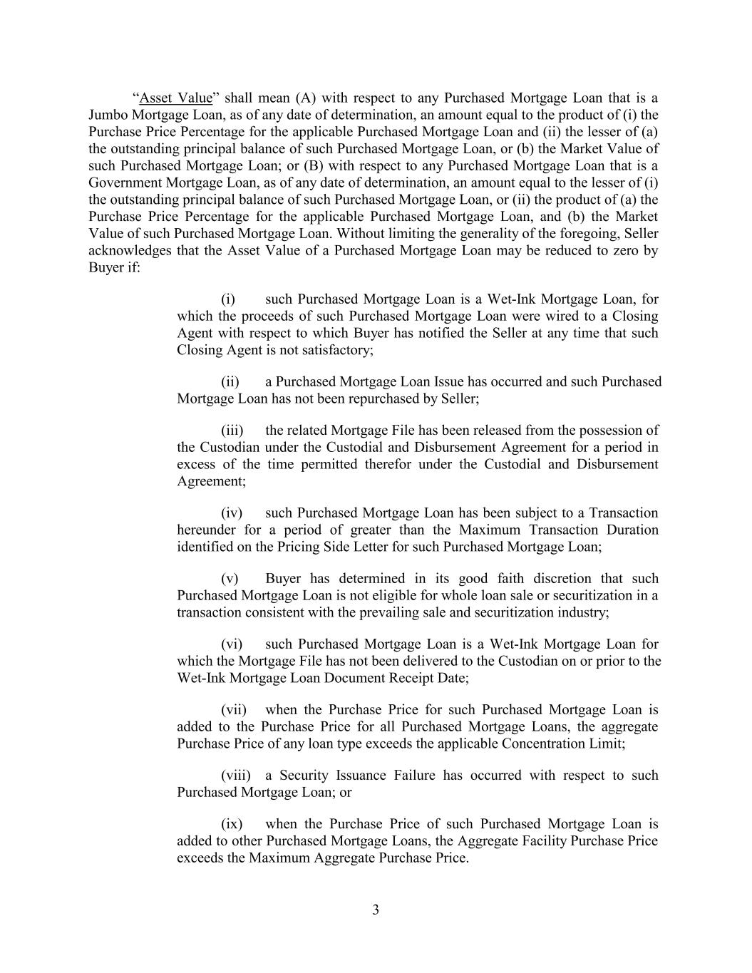 “Asset Value” shall mean (A) with respect to any Purchased Mortgage Loan that is a Jumbo Mortgage Loan, as of any date of determination, an amount equal to the product of (i) the Purchase Price Percentage for the applicable Purchased Mortgage Loan and (ii) the lesser of (a) the outstanding principal balance of such Purchased Mortgage Loan, or (b) the Market Value of such Purchased Mortgage Loan; or (B) with respect to any Purchased Mortgage Loan that is a Government Mortgage Loan, as of any date of determination, an amount equal to the lesser of (i) the outstanding principal balance of such Purchased Mortgage Loan, or (ii) the product of (a) the Purchase Price Percentage for the applicable Purchased Mortgage Loan, and (b) the Market Value of such Purchased Mortgage Loan. Without limiting the generality of the foregoing, Seller acknowledges that the Asset Value of a Purchased Mortgage Loan may be reduced to zero by Buyer if: (i) such Purchased Mortgage Loan is a Wet-Ink Mortgage Loan, for which the proceeds of such Purchased Mortgage Loan were wired to a Closing Agent with respect to which Buyer has notified the Seller at any time that such Closing Agent is not satisfactory; (ii) a Purchased Mortgage Loan Issue has occurred and such Purchased Mortgage Loan has not been repurchased by Seller; (iii) the related Mortgage File has been released from the possession of the Custodian under the Custodial and Disbursement Agreement for a period in excess of the time permitted therefor under the Custodial and Disbursement Agreement; (iv) such Purchased Mortgage Loan has been subject to a Transaction hereunder for a period of greater than the Maximum Transaction Duration identified on the Pricing Side Letter for such Purchased Mortgage Loan; (v) Buyer has determined in its good faith discretion that such Purchased Mortgage Loan is not eligible for whole loan sale or securitization in a transaction consistent with the prevailing sale and securitization industry; (vi) such Purchased Mortgage Loan is a Wet-Ink Mortgage Loan for which the Mortgage File has not been delivered to the Custodian on or prior to the Wet-Ink Mortgage Loan Document Receipt Date; (vii) when the Purchase Price for such Purchased Mortgage Loan is added to the Purchase Price for all Purchased Mortgage Loans, the aggregate Purchase Price of any loan type exceeds the applicable Concentration Limit; (viii) a Security Issuance Failure has occurred with respect to such Purchased Mortgage Loan; or (ix) when the Purchase Price of such Purchased Mortgage Loan is added to other Purchased Mortgage Loans, the Aggregate Facility Purchase Price exceeds the Maximum Aggregate Purchase Price. 3
