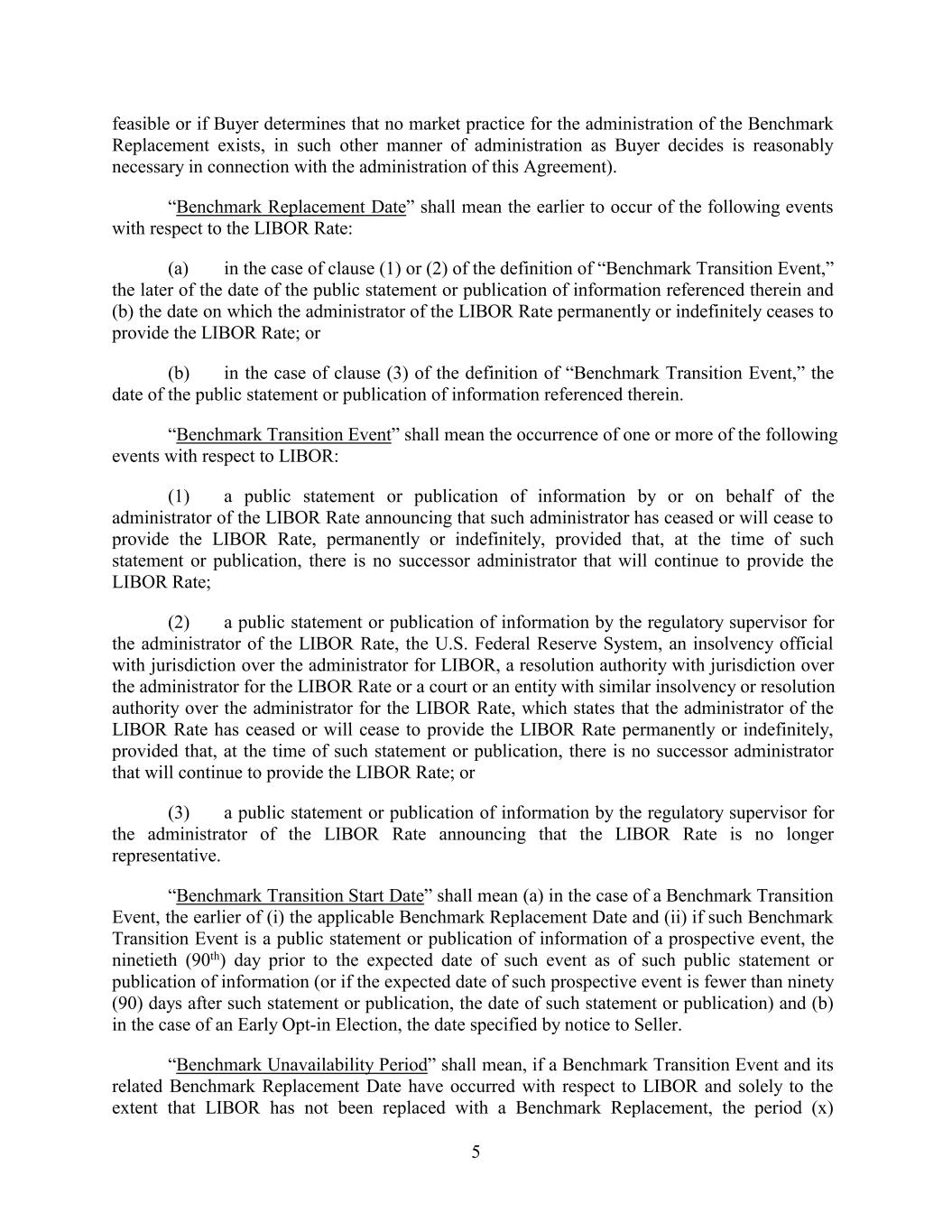 feasible or if Buyer determines that no market practice for the administration of the Benchmark Replacement exists, in such other manner of administration as Buyer decides is reasonably necessary in connection with the administration of this Agreement). “Benchmark Replacement Date” shall mean the earlier to occur of the following events with respect to the LIBOR Rate: (a) in the case of clause (1) or (2) of the definition of “Benchmark Transition Event,” the later of the date of the public statement or publication of information referenced therein and (b) the date on which the administrator of the LIBOR Rate permanently or indefinitely ceases to provide the LIBOR Rate; or (b) in the case of clause (3) of the definition of “Benchmark Transition Event,” the date of the public statement or publication of information referenced therein. “Benchmark Transition Event” shall mean the occurrence of one or more of the following events with respect to LIBOR: (1) a public statement or publication of information by or on behalf of the administrator of the LIBOR Rate announcing that such administrator has ceased or will cease to provide the LIBOR Rate, permanently or indefinitely, provided that, at the time of such statement or publication, there is no successor administrator that will continue to provide the LIBOR Rate; (2) a public statement or publication of information by the regulatory supervisor for the administrator of the LIBOR Rate, the U.S. Federal Reserve System, an insolvency official with jurisdiction over the administrator for LIBOR, a resolution authority with jurisdiction over the administrator for the LIBOR Rate or a court or an entity with similar insolvency or resolution authority over the administrator for the LIBOR Rate, which states that the administrator of the LIBOR Rate has ceased or will cease to provide the LIBOR Rate permanently or indefinitely, provided that, at the time of such statement or publication, there is no successor administrator that will continue to provide the LIBOR Rate; or (3) a public statement or publication of information by the regulatory supervisor for the administrator of the LIBOR Rate announcing that the LIBOR Rate is no longer representative. “Benchmark Transition Start Date” shall mean (a) in the case of a Benchmark Transition Event, the earlier of (i) the applicable Benchmark Replacement Date and (ii) if such Benchmark Transition Event is a public statement or publication of information of a prospective event, the ninetieth (90th) day prior to the expected date of such event as of such public statement or publication of information (or if the expected date of such prospective event is fewer than ninety (90) days after such statement or publication, the date of such statement or publication) and (b) in the case of an Early Opt-in Election, the date specified by notice to Seller. “Benchmark Unavailability Period” shall mean, if a Benchmark Transition Event and its related Benchmark Replacement Date have occurred with respect to LIBOR and solely to the extent that LIBOR has not been replaced with a Benchmark Replacement, the period (x) 5