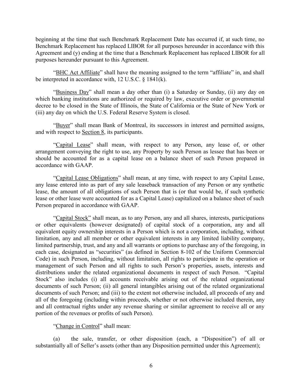 beginning at the time that such Benchmark Replacement Date has occurred if, at such time, no Benchmark Replacement has replaced LIBOR for all purposes hereunder in accordance with this Agreement and (y) ending at the time that a Benchmark Replacement has replaced LIBOR for all purposes hereunder pursuant to this Agreement. “BHC Act Affiliate” shall have the meaning assigned to the term “affiliate” in, and shall be interpreted in accordance with, 12 U.S.C. § 1841(k). “Business Day” shall mean a day other than (i) a Saturday or Sunday, (ii) any day on which banking institutions are authorized or required by law, executive order or governmental decree to be closed in the State of Illinois, the State of California or the State of New York or (iii) any day on which the U.S. Federal Reserve System is closed. “Buyer” shall mean Bank of Montreal, its successors in interest and permitted assigns, and with respect to Section 8, its participants. “Capital Lease” shall mean, with respect to any Person, any lease of, or other arrangement conveying the right to use, any Property by such Person as lessee that has been or should be accounted for as a capital lease on a balance sheet of such Person prepared in accordance with GAAP. “Capital Lease Obligations” shall mean, at any time, with respect to any Capital Lease, any lease entered into as part of any sale leaseback transaction of any Person or any synthetic lease, the amount of all obligations of such Person that is (or that would be, if such synthetic lease or other lease were accounted for as a Capital Lease) capitalized on a balance sheet of such Person prepared in accordance with GAAP. “Capital Stock” shall mean, as to any Person, any and all shares, interests, participations or other equivalents (however designated) of capital stock of a corporation, any and all equivalent equity ownership interests in a Person which is not a corporation, including, without limitation, any and all member or other equivalent interests in any limited liability company, limited partnership, trust, and any and all warrants or options to purchase any of the foregoing, in each case, designated as “securities” (as defined in Section 8-102 of the Uniform Commercial Code) in such Person, including, without limitation, all rights to participate in the operation or management of such Person and all rights to such Person’s properties, assets, interests and distributions under the related organizational documents in respect of such Person. “Capital Stock” also includes (i) all accounts receivable arising out of the related organizational documents of such Person; (ii) all general intangibles arising out of the related organizational documents of such Person; and (iii) to the extent not otherwise included, all proceeds of any and all of the foregoing (including within proceeds, whether or not otherwise included therein, any and all contractual rights under any revenue sharing or similar agreement to receive all or any portion of the revenues or profits of such Person). “Change in Control” shall mean: (a) the sale, transfer, or other disposition (each, a “Disposition”) of all or substantially all of Seller’s assets (other than any Disposition permitted under this Agreement); 6