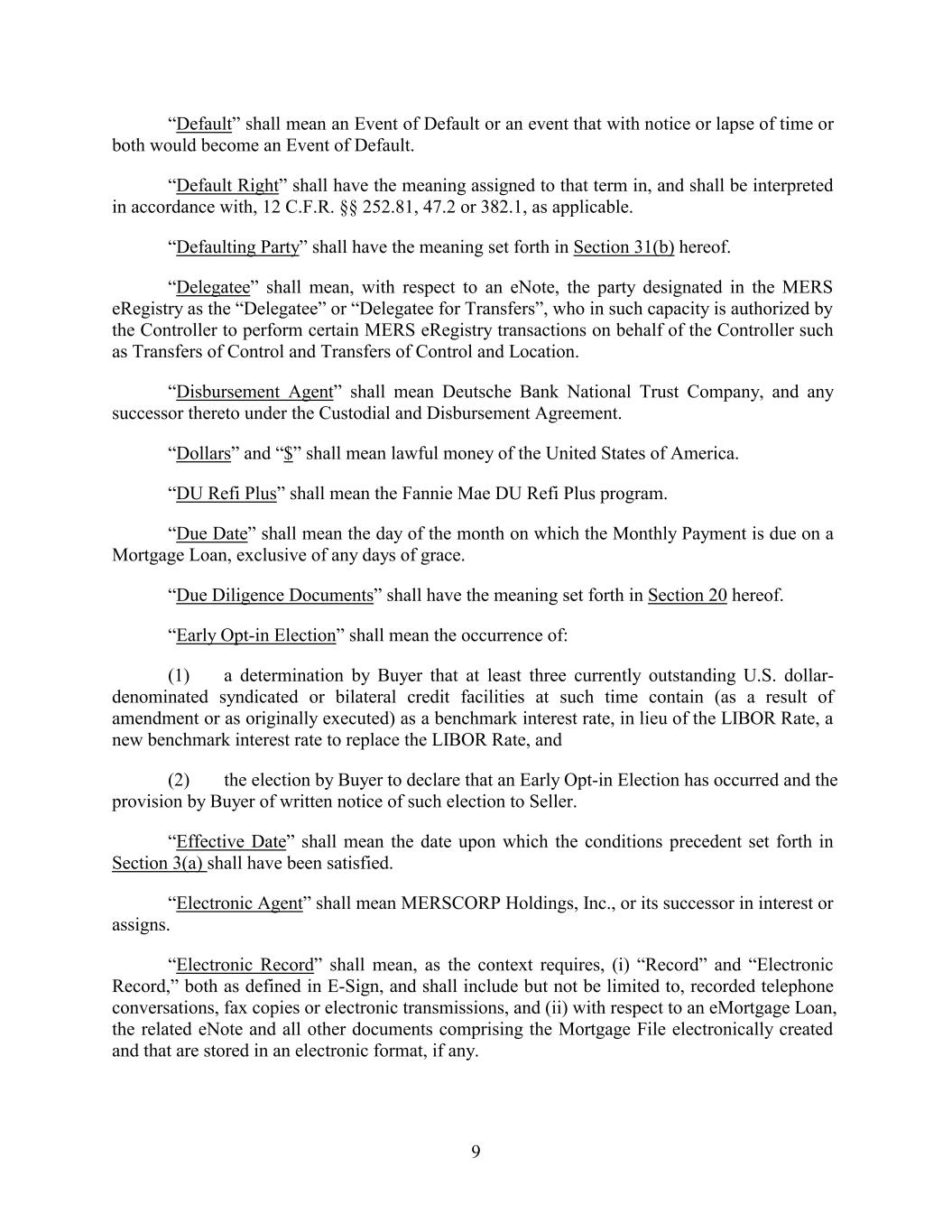 “Default” shall mean an Event of Default or an event that with notice or lapse of time or both would become an Event of Default. “Default Right” shall have the meaning assigned to that term in, and shall be interpreted in accordance with, 12 C.F.R. §§ 252.81, 47.2 or 382.1, as applicable. “Defaulting Party” shall have the meaning set forth in Section 31(b) hereof. “Delegatee” shall mean, with respect to an eNote, the party designated in the MERS eRegistry as the “Delegatee” or “Delegatee for Transfers”, who in such capacity is authorized by the Controller to perform certain MERS eRegistry transactions on behalf of the Controller such as Transfers of Control and Transfers of Control and Location. “Disbursement Agent” shall mean Deutsche Bank National Trust Company, and any successor thereto under the Custodial and Disbursement Agreement. “Dollars” and “$” shall mean lawful money of the United States of America. “DU Refi Plus” shall mean the Fannie Mae DU Refi Plus program. “Due Date” shall mean the day of the month on which the Monthly Payment is due on a Mortgage Loan, exclusive of any days of grace. “Due Diligence Documents” shall have the meaning set forth in Section 20 hereof. “Early Opt-in Election” shall mean the occurrence of: (1) a determination by Buyer that at least three currently outstanding U.S. dollar- denominated syndicated or bilateral credit facilities at such time contain (as a result of amendment or as originally executed) as a benchmark interest rate, in lieu of the LIBOR Rate, a new benchmark interest rate to replace the LIBOR Rate, and (2) the election by Buyer to declare that an Early Opt-in Election has occurred and the provision by Buyer of written notice of such election to Seller. “Effective Date” shall mean the date upon which the conditions precedent set forth in Section 3(a) shall have been satisfied. “Electronic Agent” shall mean MERSCORP Holdings, Inc., or its successor in interest or assigns. “Electronic Record” shall mean, as the context requires, (i) “Record” and “Electronic Record,” both as defined in E-Sign, and shall include but not be limited to, recorded telephone conversations, fax copies or electronic transmissions, and (ii) with respect to an eMortgage Loan, the related eNote and all other documents comprising the Mortgage File electronically created and that are stored in an electronic format, if any. 9