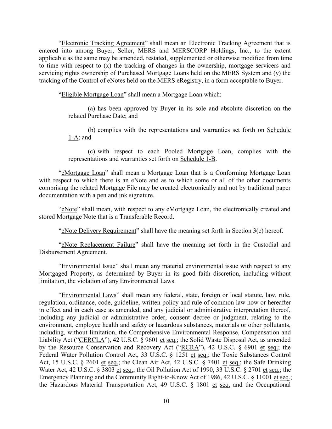 “Electronic Tracking Agreement” shall mean an Electronic Tracking Agreement that is entered into among Buyer, Seller, MERS and MERSCORP Holdings, Inc., to the extent applicable as the same may be amended, restated, supplemented or otherwise modified from time to time with respect to (x) the tracking of changes in the ownership, mortgage servicers and servicing rights ownership of Purchased Mortgage Loans held on the MERS System and (y) the tracking of the Control of eNotes held on the MERS eRegistry, in a form acceptable to Buyer. “Eligible Mortgage Loan” shall mean a Mortgage Loan which: (a) has been approved by Buyer in its sole and absolute discretion on the related Purchase Date; and (b) complies with the representations and warranties set forth on Schedule 1-A; and (c) with respect to each Pooled Mortgage Loan, complies with the representations and warranties set forth on Schedule 1-B. “eMortgage Loan” shall mean a Mortgage Loan that is a Conforming Mortgage Loan with respect to which there is an eNote and as to which some or all of the other documents comprising the related Mortgage File may be created electronically and not by traditional paper documentation with a pen and ink signature. “eNote” shall mean, with respect to any eMortgage Loan, the electronically created and stored Mortgage Note that is a Transferable Record. “eNote Delivery Requirement” shall have the meaning set forth in Section 3(c) hereof. “eNote Replacement Failure” shall have the meaning set forth in the Custodial and Disbursement Agreement. “Environmental Issue” shall mean any material environmental issue with respect to any Mortgaged Property, as determined by Buyer in its good faith discretion, including without limitation, the violation of any Environmental Laws. “Environmental Laws” shall mean any federal, state, foreign or local statute, law, rule, regulation, ordinance, code, guideline, written policy and rule of common law now or hereafter in effect and in each case as amended, and any judicial or administrative interpretation thereof, including any judicial or administrative order, consent decree or judgment, relating to the environment, employee health and safety or hazardous substances, materials or other pollutants, including, without limitation, the Comprehensive Environmental Response, Compensation and Liability Act (“CERCLA”), 42 U.S.C. § 9601 et seq.; the Solid Waste Disposal Act, as amended by the Resource Conservation and Recovery Act (“RCRA”), 42 U.S.C. § 6901 et seq.; the Federal Water Pollution Control Act, 33 U.S.C. § 1251 et seq.; the Toxic Substances Control Act, 15 U.S.C. § 2601 et seq.; the Clean Air Act, 42 U.S.C. § 7401 et seq.; the Safe Drinking Water Act, 42 U.S.C. § 3803 et seq.; the Oil Pollution Act of 1990, 33 U.S.C. § 2701 et seq.; the Emergency Planning and the Community Right-to-Know Act of 1986, 42 U.S.C. § 11001 et seq.; the Hazardous Material Transportation Act, 49 U.S.C. § 1801 et seq. and the Occupational 10