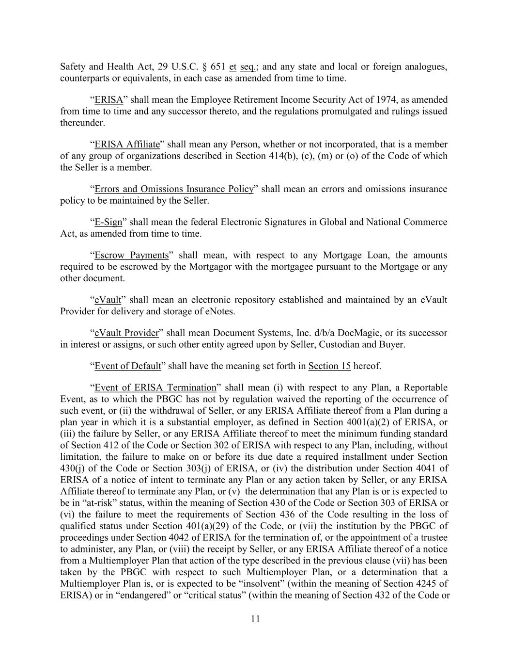 Safety and Health Act, 29 U.S.C. § 651 et seq.; and any state and local or foreign analogues, counterparts or equivalents, in each case as amended from time to time. “ERISA” shall mean the Employee Retirement Income Security Act of 1974, as amended from time to time and any successor thereto, and the regulations promulgated and rulings issued thereunder. “ERISA Affiliate” shall mean any Person, whether or not incorporated, that is a member of any group of organizations described in Section 414(b), (c), (m) or (o) of the Code of which the Seller is a member. “Errors and Omissions Insurance Policy” shall mean an errors and omissions insurance policy to be maintained by the Seller. “E-Sign” shall mean the federal Electronic Signatures in Global and National Commerce Act, as amended from time to time. “Escrow Payments” shall mean, with respect to any Mortgage Loan, the amounts required to be escrowed by the Mortgagor with the mortgagee pursuant to the Mortgage or any other document. “eVault” shall mean an electronic repository established and maintained by an eVault Provider for delivery and storage of eNotes. “eVault Provider” shall mean Document Systems, Inc. d/b/a DocMagic, or its successor in interest or assigns, or such other entity agreed upon by Seller, Custodian and Buyer. “Event of Default” shall have the meaning set forth in Section 15 hereof. “Event of ERISA Termination” shall mean (i) with respect to any Plan, a Reportable Event, as to which the PBGC has not by regulation waived the reporting of the occurrence of such event, or (ii) the withdrawal of Seller, or any ERISA Affiliate thereof from a Plan during a plan year in which it is a substantial employer, as defined in Section 4001(a)(2) of ERISA, or (iii) the failure by Seller, or any ERISA Affiliate thereof to meet the minimum funding standard of Section 412 of the Code or Section 302 of ERISA with respect to any Plan, including, without limitation, the failure to make on or before its due date a required installment under Section 430(j) of the Code or Section 303(j) of ERISA, or (iv) the distribution under Section 4041 of ERISA of a notice of intent to terminate any Plan or any action taken by Seller, or any ERISA Affiliate thereof to terminate any Plan, or (v) the determination that any Plan is or is expected to be in “at-risk” status, within the meaning of Section 430 of the Code or Section 303 of ERISA or (vi) the failure to meet the requirements of Section 436 of the Code resulting in the loss of qualified status under Section 401(a)(29) of the Code, or (vii) the institution by the PBGC of proceedings under Section 4042 of ERISA for the termination of, or the appointment of a trustee to administer, any Plan, or (viii) the receipt by Seller, or any ERISA Affiliate thereof of a notice from a Multiemployer Plan that action of the type described in the previous clause (vii) has been taken by the PBGC with respect to such Multiemployer Plan, or a determination that a Multiemployer Plan is, or is expected to be “insolvent” (within the meaning of Section 4245 of ERISA) or in “endangered” or “critical status” (within the meaning of Section 432 of the Code or 11