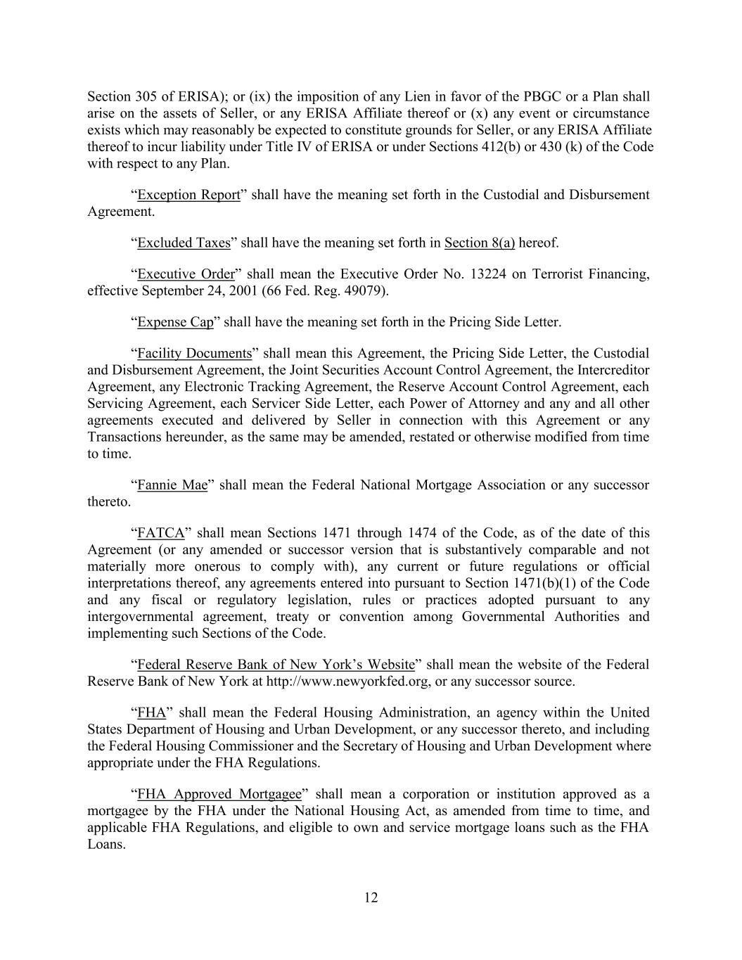 Section 305 of ERISA); or (ix) the imposition of any Lien in favor of the PBGC or a Plan shall arise on the assets of Seller, or any ERISA Affiliate thereof or (x) any event or circumstance exists which may reasonably be expected to constitute grounds for Seller, or any ERISA Affiliate thereof to incur liability under Title IV of ERISA or under Sections 412(b) or 430 (k) of the Code with respect to any Plan. “Exception Report” shall have the meaning set forth in the Custodial and Disbursement Agreement. “Excluded Taxes” shall have the meaning set forth in Section 8(a) hereof. “Executive Order” shall mean the Executive Order No. 13224 on Terrorist Financing, effective September 24, 2001 (66 Fed. Reg. 49079). “Expense Cap” shall have the meaning set forth in the Pricing Side Letter. “Facility Documents” shall mean this Agreement, the Pricing Side Letter, the Custodial and Disbursement Agreement, the Joint Securities Account Control Agreement, the Intercreditor Agreement, any Electronic Tracking Agreement, the Reserve Account Control Agreement, each Servicing Agreement, each Servicer Side Letter, each Power of Attorney and any and all other agreements executed and delivered by Seller in connection with this Agreement or any Transactions hereunder, as the same may be amended, restated or otherwise modified from time to time. “Fannie Mae” shall mean the Federal National Mortgage Association or any successor thereto. “FATCA” shall mean Sections 1471 through 1474 of the Code, as of the date of this Agreement (or any amended or successor version that is substantively comparable and not materially more onerous to comply with), any current or future regulations or official interpretations thereof, any agreements entered into pursuant to Section 1471(b)(1) of the Code and any fiscal or regulatory legislation, rules or practices adopted pursuant to any intergovernmental agreement, treaty or convention among Governmental Authorities and implementing such Sections of the Code. “Federal Reserve Bank of New York’s Website” shall mean the website of the Federal Reserve Bank of New York at http://www.newyorkfed.org, or any successor source. “FHA” shall mean the Federal Housing Administration, an agency within the United States Department of Housing and Urban Development, or any successor thereto, and including the Federal Housing Commissioner and the Secretary of Housing and Urban Development where appropriate under the FHA Regulations. “FHA Approved Mortgagee” shall mean a corporation or institution approved as a mortgagee by the FHA under the National Housing Act, as amended from time to time, and applicable FHA Regulations, and eligible to own and service mortgage loans such as the FHA Loans. 12