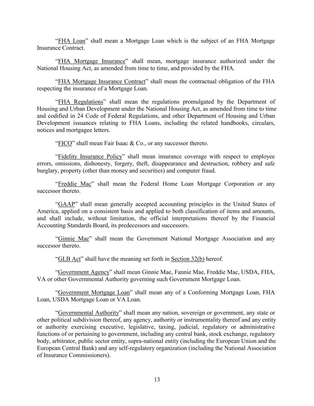 “FHA Loan” shall mean a Mortgage Loan which is the subject of an FHA Mortgage Insurance Contract. “FHA Mortgage Insurance” shall mean, mortgage insurance authorized under the National Housing Act, as amended from time to time, and provided by the FHA. “FHA Mortgage Insurance Contract” shall mean the contractual obligation of the FHA respecting the insurance of a Mortgage Loan. “FHA Regulations” shall mean the regulations promulgated by the Department of Housing and Urban Development under the National Housing Act, as amended from time to time and codified in 24 Code of Federal Regulations, and other Department of Housing and Urban Development issuances relating to FHA Loans, including the related handbooks, circulars, notices and mortgagee letters. “FICO” shall mean Fair Isaac & Co., or any successor thereto. “Fidelity Insurance Policy” shall mean insurance coverage with respect to employee errors, omissions, dishonesty, forgery, theft, disappearance and destruction, robbery and safe burglary, property (other than money and securities) and computer fraud. “Freddie Mac” shall mean the Federal Home Loan Mortgage Corporation or any successor thereto. “GAAP” shall mean generally accepted accounting principles in the United States of America, applied on a consistent basis and applied to both classification of items and amounts, and shall include, without limitation, the official interpretations thereof by the Financial Accounting Standards Board, its predecessors and successors. “Ginnie Mae” shall mean the Government National Mortgage Association and any successor thereto. “GLB Act” shall have the meaning set forth in Section 32(b) hereof. “Government Agency” shall mean Ginnie Mae, Fannie Mae, Freddie Mac, USDA, FHA, VA or other Governmental Authority governing such Government Mortgage Loan. “Government Mortgage Loan” shall mean any of a Conforming Mortgage Loan, FHA Loan, USDA Mortgage Loan or VA Loan. “Governmental Authority” shall mean any nation, sovereign or government, any state or other political subdivision thereof, any agency, authority or instrumentality thereof and any entity or authority exercising executive, legislative, taxing, judicial, regulatory or administrative functions of or pertaining to government, including any central bank, stock exchange, regulatory body, arbitrator, public sector entity, supra-national entity (including the European Union and the European Central Bank) and any self-regulatory organization (including the National Association of Insurance Commissioners). 13