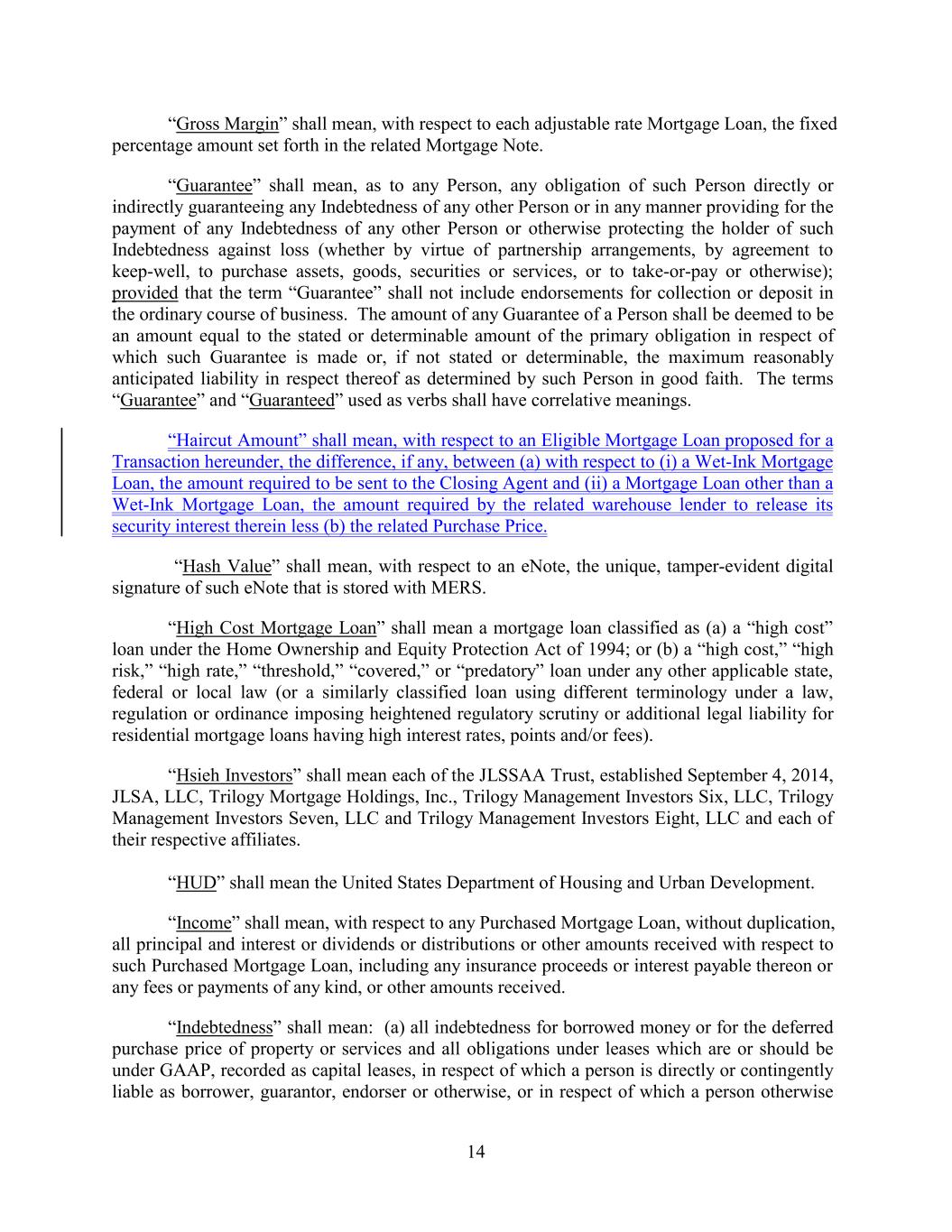 “Gross Margin” shall mean, with respect to each adjustable rate Mortgage Loan, the fixed percentage amount set forth in the related Mortgage Note. “Guarantee” shall mean, as to any Person, any obligation of such Person directly or indirectly guaranteeing any Indebtedness of any other Person or in any manner providing for the payment of any Indebtedness of any other Person or otherwise protecting the holder of such Indebtedness against loss (whether by virtue of partnership arrangements, by agreement to keep-well, to purchase assets, goods, securities or services, or to take-or-pay or otherwise); provided that the term “Guarantee” shall not include endorsements for collection or deposit in the ordinary course of business. The amount of any Guarantee of a Person shall be deemed to be an amount equal to the stated or determinable amount of the primary obligation in respect of which such Guarantee is made or, if not stated or determinable, the maximum reasonably anticipated liability in respect thereof as determined by such Person in good faith. The terms “Guarantee” and “Guaranteed” used as verbs shall have correlative meanings. “Haircut Amount” shall mean, with respect to an Eligible Mortgage Loan proposed for a Transaction hereunder, the difference, if any, between (a) with respect to (i) a Wet-Ink Mortgage Loan, the amount required to be sent to the Closing Agent and (ii) a Mortgage Loan other than a Wet-Ink Mortgage Loan, the amount required by the related warehouse lender to release its security interest therein less (b) the related Purchase Price. “Hash Value” shall mean, with respect to an eNote, the unique, tamper-evident digital signature of such eNote that is stored with MERS. “High Cost Mortgage Loan” shall mean a mortgage loan classified as (a) a “high cost” loan under the Home Ownership and Equity Protection Act of 1994; or (b) a “high cost,” “high risk,” “high rate,” “threshold,” “covered,” or “predatory” loan under any other applicable state, federal or local law (or a similarly classified loan using different terminology under a law, regulation or ordinance imposing heightened regulatory scrutiny or additional legal liability for residential mortgage loans having high interest rates, points and/or fees). “Hsieh Investors” shall mean each of the JLSSAA Trust, established September 4, 2014, JLSA, LLC, Trilogy Mortgage Holdings, Inc., Trilogy Management Investors Six, LLC, Trilogy Management Investors Seven, LLC and Trilogy Management Investors Eight, LLC and each of their respective affiliates. “HUD” shall mean the United States Department of Housing and Urban Development. “Income” shall mean, with respect to any Purchased Mortgage Loan, without duplication, all principal and interest or dividends or distributions or other amounts received with respect to such Purchased Mortgage Loan, including any insurance proceeds or interest payable thereon or any fees or payments of any kind, or other amounts received. “Indebtedness” shall mean: (a) all indebtedness for borrowed money or for the deferred purchase price of property or services and all obligations under leases which are or should be under GAAP, recorded as capital leases, in respect of which a person is directly or contingently liable as borrower, guarantor, endorser or otherwise, or in respect of which a person otherwise 14