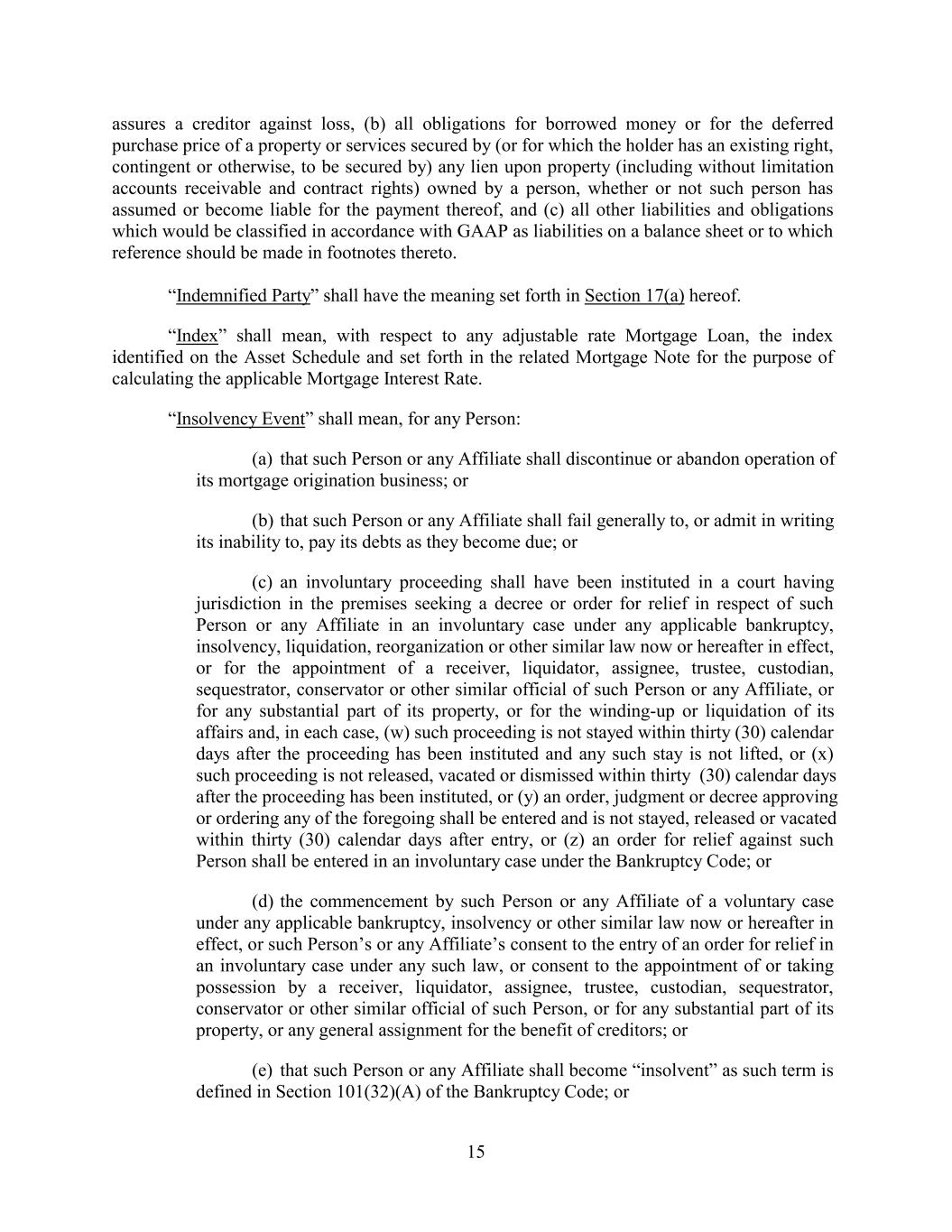 assures a creditor against loss, (b) all obligations for borrowed money or for the deferred purchase price of a property or services secured by (or for which the holder has an existing right, contingent or otherwise, to be secured by) any lien upon property (including without limitation accounts receivable and contract rights) owned by a person, whether or not such person has assumed or become liable for the payment thereof, and (c) all other liabilities and obligations which would be classified in accordance with GAAP as liabilities on a balance sheet or to which reference should be made in footnotes thereto. “Indemnified Party” shall have the meaning set forth in Section 17(a) hereof. “Index” shall mean, with respect to any adjustable rate Mortgage Loan, the index identified on the Asset Schedule and set forth in the related Mortgage Note for the purpose of calculating the applicable Mortgage Interest Rate. “Insolvency Event” shall mean, for any Person: (a) that such Person or any Affiliate shall discontinue or abandon operation of its mortgage origination business; or (b) that such Person or any Affiliate shall fail generally to, or admit in writing its inability to, pay its debts as they become due; or (c) an involuntary proceeding shall have been instituted in a court having jurisdiction in the premises seeking a decree or order for relief in respect of such Person or any Affiliate in an involuntary case under any applicable bankruptcy, insolvency, liquidation, reorganization or other similar law now or hereafter in effect, or for the appointment of a receiver, liquidator, assignee, trustee, custodian, sequestrator, conservator or other similar official of such Person or any Affiliate, or for any substantial part of its property, or for the winding-up or liquidation of its affairs and, in each case, (w) such proceeding is not stayed within thirty (30) calendar days after the proceeding has been instituted and any such stay is not lifted, or (x) such proceeding is not released, vacated or dismissed within thirty (30) calendar days after the proceeding has been instituted, or (y) an order, judgment or decree approving or ordering any of the foregoing shall be entered and is not stayed, released or vacated within thirty (30) calendar days after entry, or (z) an order for relief against such Person shall be entered in an involuntary case under the Bankruptcy Code; or (d) the commencement by such Person or any Affiliate of a voluntary case under any applicable bankruptcy, insolvency or other similar law now or hereafter in effect, or such Person’s or any Affiliate’s consent to the entry of an order for relief in an involuntary case under any such law, or consent to the appointment of or taking possession by a receiver, liquidator, assignee, trustee, custodian, sequestrator, conservator or other similar official of such Person, or for any substantial part of its property, or any general assignment for the benefit of creditors; or (e) that such Person or any Affiliate shall become “insolvent” as such term is defined in Section 101(32)(A) of the Bankruptcy Code; or 15