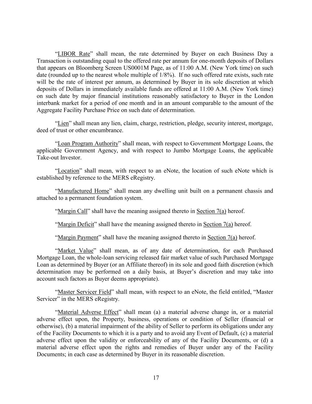“LIBOR Rate” shall mean, the rate determined by Buyer on each Business Day a Transaction is outstanding equal to the offered rate per annum for one-month deposits of Dollars that appears on Bloomberg Screen US0001M Page, as of 11:00 A.M. (New York time) on such date (rounded up to the nearest whole multiple of 1/8%). If no such offered rate exists, such rate will be the rate of interest per annum, as determined by Buyer in its sole discretion at which deposits of Dollars in immediately available funds are offered at 11:00 A.M. (New York time) on such date by major financial institutions reasonably satisfactory to Buyer in the London interbank market for a period of one month and in an amount comparable to the amount of the Aggregate Facility Purchase Price on such date of determination. “Lien” shall mean any lien, claim, charge, restriction, pledge, security interest, mortgage, deed of trust or other encumbrance. “Loan Program Authority” shall mean, with respect to Government Mortgage Loans, the applicable Government Agency, and with respect to Jumbo Mortgage Loans, the applicable Take-out Investor. “Location” shall mean, with respect to an eNote, the location of such eNote which is established by reference to the MERS eRegistry. “Manufactured Home” shall mean any dwelling unit built on a permanent chassis and attached to a permanent foundation system. “Margin Call” shall have the meaning assigned thereto in Section 7(a) hereof. “Margin Deficit” shall have the meaning assigned thereto in Section 7(a) hereof. “Margin Payment” shall have the meaning assigned thereto in Section 7(a) hereof. “Market Value” shall mean, as of any date of determination, for each Purchased Mortgage Loan, the whole-loan servicing released fair market value of such Purchased Mortgage Loan as determined by Buyer (or an Affiliate thereof) in its sole and good faith discretion (which determination may be performed on a daily basis, at Buyer’s discretion and may take into account such factors as Buyer deems appropriate). “Master Servicer Field” shall mean, with respect to an eNote, the field entitled, “Master Servicer” in the MERS eRegistry. “Material Adverse Effect” shall mean (a) a material adverse change in, or a material adverse effect upon, the Property, business, operations or condition of Seller (financial or otherwise), (b) a material impairment of the ability of Seller to perform its obligations under any of the Facility Documents to which it is a party and to avoid any Event of Default, (c) a material adverse effect upon the validity or enforceability of any of the Facility Documents, or (d) a material adverse effect upon the rights and remedies of Buyer under any of the Facility Documents; in each case as determined by Buyer in its reasonable discretion. 17