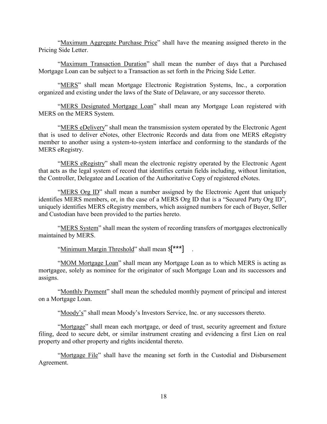 “Maximum Aggregate Purchase Price” shall have the meaning assigned thereto in the Pricing Side Letter. “Maximum Transaction Duration” shall mean the number of days that a Purchased Mortgage Loan can be subject to a Transaction as set forth in the Pricing Side Letter. “MERS” shall mean Mortgage Electronic Registration Systems, Inc., a corporation organized and existing under the laws of the State of Delaware, or any successor thereto. “MERS Designated Mortgage Loan” shall mean any Mortgage Loan registered with MERS on the MERS System. “MERS eDelivery” shall mean the transmission system operated by the Electronic Agent that is used to deliver eNotes, other Electronic Records and data from one MERS eRegistry member to another using a system-to-system interface and conforming to the standards of the MERS eRegistry. “MERS eRegistry” shall mean the electronic registry operated by the Electronic Agent that acts as the legal system of record that identifies certain fields including, without limitation, the Controller, Delegatee and Location of the Authoritative Copy of registered eNotes. “MERS Org ID” shall mean a number assigned by the Electronic Agent that uniquely identifies MERS members, or, in the case of a MERS Org ID that is a “Secured Party Org ID”, uniquely identifies MERS eRegistry members, which assigned numbers for each of Buyer, Seller and Custodian have been provided to the parties hereto. “MERS System” shall mean the system of recording transfers of mortgages electronically maintained by MERS. “Minimum Margin Threshold” shall mean $ . “MOM Mortgage Loan” shall mean any Mortgage Loan as to which MERS is acting as mortgagee, solely as nominee for the originator of such Mortgage Loan and its successors and assigns. “Monthly Payment” shall mean the scheduled monthly payment of principal and interest on a Mortgage Loan. “Moody’s” shall mean Moody’s Investors Service, Inc. or any successors thereto. “Mortgage” shall mean each mortgage, or deed of trust, security agreement and fixture filing, deed to secure debt, or similar instrument creating and evidencing a first Lien on real property and other property and rights incidental thereto. “Mortgage File” shall have the meaning set forth in the Custodial and Disbursement Agreement. 18 [***]