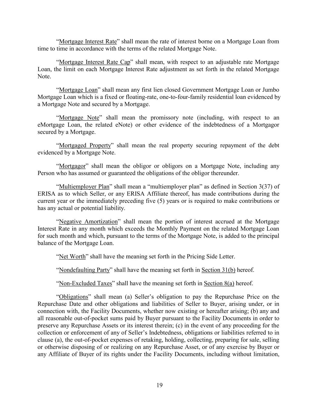 “Mortgage Interest Rate” shall mean the rate of interest borne on a Mortgage Loan from time to time in accordance with the terms of the related Mortgage Note. “Mortgage Interest Rate Cap” shall mean, with respect to an adjustable rate Mortgage Loan, the limit on each Mortgage Interest Rate adjustment as set forth in the related Mortgage Note. “Mortgage Loan” shall mean any first lien closed Government Mortgage Loan or Jumbo Mortgage Loan which is a fixed or floating-rate, one-to-four-family residential loan evidenced by a Mortgage Note and secured by a Mortgage. “Mortgage Note” shall mean the promissory note (including, with respect to an eMortgage Loan, the related eNote) or other evidence of the indebtedness of a Mortgagor secured by a Mortgage. “Mortgaged Property” shall mean the real property securing repayment of the debt evidenced by a Mortgage Note. “Mortgagor” shall mean the obligor or obligors on a Mortgage Note, including any Person who has assumed or guaranteed the obligations of the obligor thereunder. “Multiemployer Plan” shall mean a “multiemployer plan” as defined in Section 3(37) of ERISA as to which Seller, or any ERISA Affiliate thereof, has made contributions during the current year or the immediately preceding five (5) years or is required to make contributions or has any actual or potential liability. “Negative Amortization” shall mean the portion of interest accrued at the Mortgage Interest Rate in any month which exceeds the Monthly Payment on the related Mortgage Loan for such month and which, pursuant to the terms of the Mortgage Note, is added to the principal balance of the Mortgage Loan. “Net Worth” shall have the meaning set forth in the Pricing Side Letter. “Nondefaulting Party” shall have the meaning set forth in Section 31(b) hereof. “Non-Excluded Taxes” shall have the meaning set forth in Section 8(a) hereof. “Obligations” shall mean (a) Seller’s obligation to pay the Repurchase Price on the Repurchase Date and other obligations and liabilities of Seller to Buyer, arising under, or in connection with, the Facility Documents, whether now existing or hereafter arising; (b) any and all reasonable out-of-pocket sums paid by Buyer pursuant to the Facility Documents in order to preserve any Repurchase Assets or its interest therein; (c) in the event of any proceeding for the collection or enforcement of any of Seller’s Indebtedness, obligations or liabilities referred to in clause (a), the out-of-pocket expenses of retaking, holding, collecting, preparing for sale, selling or otherwise disposing of or realizing on any Repurchase Asset, or of any exercise by Buyer or any Affiliate of Buyer of its rights under the Facility Documents, including without limitation, 19
