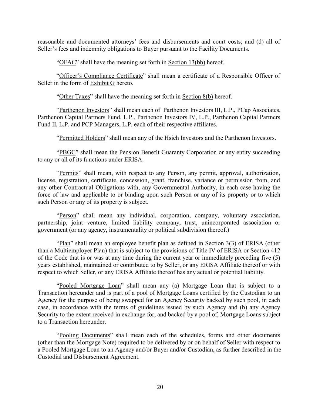 reasonable and documented attorneys’ fees and disbursements and court costs; and (d) all of Seller’s fees and indemnity obligations to Buyer pursuant to the Facility Documents. “OFAC” shall have the meaning set forth in Section 13(bb) hereof. “Officer’s Compliance Certificate” shall mean a certificate of a Responsible Officer of Seller in the form of Exhibit G hereto. “Other Taxes” shall have the meaning set forth in Section 8(b) hereof. “Parthenon Investors” shall mean each of Parthenon Investors III, L.P., PCap Associates, Parthenon Capital Partners Fund, L.P., Parthenon Investors IV, L.P., Parthenon Capital Partners Fund II, L.P. and PCP Managers, L.P. each of their respective affiliates. “Permitted Holders” shall mean any of the Hsieh Investors and the Parthenon Investors. “PBGC” shall mean the Pension Benefit Guaranty Corporation or any entity succeeding to any or all of its functions under ERISA. “Permits” shall mean, with respect to any Person, any permit, approval, authorization, license, registration, certificate, concession, grant, franchise, variance or permission from, and any other Contractual Obligations with, any Governmental Authority, in each case having the force of law and applicable to or binding upon such Person or any of its property or to which such Person or any of its property is subject. “Person” shall mean any individual, corporation, company, voluntary association, partnership, joint venture, limited liability company, trust, unincorporated association or government (or any agency, instrumentality or political subdivision thereof.) “Plan” shall mean an employee benefit plan as defined in Section 3(3) of ERISA (other than a Multiemployer Plan) that is subject to the provisions of Title IV of ERISA or Section 412 of the Code that is or was at any time during the current year or immediately preceding five (5) years established, maintained or contributed to by Seller, or any ERISA Affiliate thereof or with respect to which Seller, or any ERISA Affiliate thereof has any actual or potential liability. “Pooled Mortgage Loan” shall mean any (a) Mortgage Loan that is subject to a Transaction hereunder and is part of a pool of Mortgage Loans certified by the Custodian to an Agency for the purpose of being swapped for an Agency Security backed by such pool, in each case, in accordance with the terms of guidelines issued by such Agency and (b) any Agency Security to the extent received in exchange for, and backed by a pool of, Mortgage Loans subject to a Transaction hereunder. “Pooling Documents” shall mean each of the schedules, forms and other documents (other than the Mortgage Note) required to be delivered by or on behalf of Seller with respect to a Pooled Mortgage Loan to an Agency and/or Buyer and/or Custodian, as further described in the Custodial and Disbursement Agreement. 20