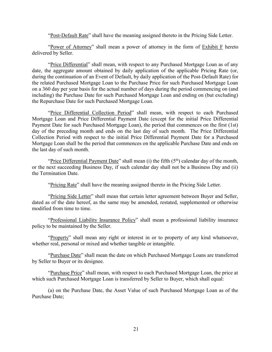 “Post-Default Rate” shall have the meaning assigned thereto in the Pricing Side Letter. “Power of Attorney” shall mean a power of attorney in the form of Exhibit F hereto delivered by Seller. “Price Differential” shall mean, with respect to any Purchased Mortgage Loan as of any date, the aggregate amount obtained by daily application of the applicable Pricing Rate (or, during the continuation of an Event of Default, by daily application of the Post-Default Rate) for the related Purchased Mortgage Loan to the Purchase Price for such Purchased Mortgage Loan on a 360 day per year basis for the actual number of days during the period commencing on (and including) the Purchase Date for such Purchased Mortgage Loan and ending on (but excluding) the Repurchase Date for such Purchased Mortgage Loan. “Price Differential Collection Period” shall mean, with respect to each Purchased Mortgage Loan and Price Differential Payment Date (except for the initial Price Differential Payment Date for such Purchased Mortgage Loan), the period that commences on the first (1st) day of the preceding month and ends on the last day of such month. The Price Differential Collection Period with respect to the initial Price Differential Payment Date for a Purchased Mortgage Loan shall be the period that commences on the applicable Purchase Date and ends on the last day of such month. “Price Differential Payment Date” shall mean (i) the fifth (5th) calendar day of the month, or the next succeeding Business Day, if such calendar day shall not be a Business Day and (ii) the Termination Date. “Pricing Rate” shall have the meaning assigned thereto in the Pricing Side Letter. “Pricing Side Letter” shall mean that certain letter agreement between Buyer and Seller, dated as of the date hereof, as the same may be amended, restated, supplemented or otherwise modified from time to time. “Professional Liability Insurance Policy” shall mean a professional liability insurance policy to be maintained by the Seller. “Property” shall mean any right or interest in or to property of any kind whatsoever, whether real, personal or mixed and whether tangible or intangible. “Purchase Date” shall mean the date on which Purchased Mortgage Loans are transferred by Seller to Buyer or its designee. “Purchase Price” shall mean, with respect to each Purchased Mortgage Loan, the price at which such Purchased Mortgage Loan is transferred by Seller to Buyer, which shall equal: (a) on the Purchase Date, the Asset Value of such Purchased Mortgage Loan as of the Purchase Date; 21