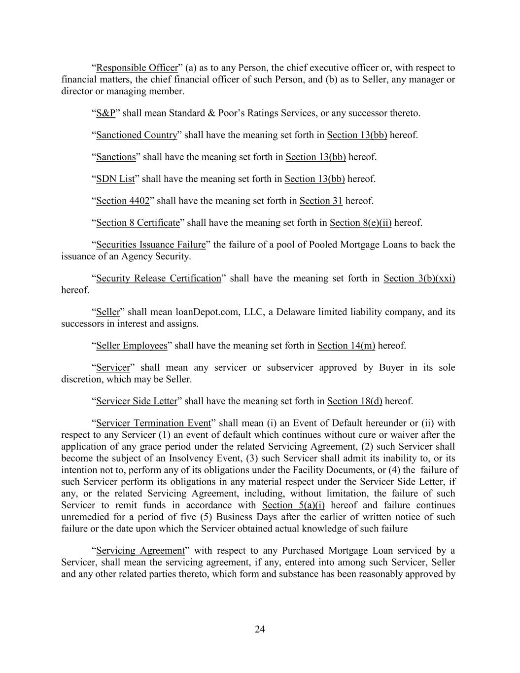 “Responsible Officer” (a) as to any Person, the chief executive officer or, with respect to financial matters, the chief financial officer of such Person, and (b) as to Seller, any manager or director or managing member. “S&P” shall mean Standard & Poor’s Ratings Services, or any successor thereto. “Sanctioned Country” shall have the meaning set forth in Section 13(bb) hereof. “Sanctions” shall have the meaning set forth in Section 13(bb) hereof. “SDN List” shall have the meaning set forth in Section 13(bb) hereof. “Section 4402” shall have the meaning set forth in Section 31 hereof. “Section 8 Certificate” shall have the meaning set forth in Section 8(e)(ii) hereof. “Securities Issuance Failure” the failure of a pool of Pooled Mortgage Loans to back the issuance of an Agency Security. “Security Release Certification” shall have the meaning set forth in Section 3(b)(xxi) hereof. “Seller” shall mean loanDepot.com, LLC, a Delaware limited liability company, and its successors in interest and assigns. “Seller Employees” shall have the meaning set forth in Section 14(m) hereof. “Servicer” shall mean any servicer or subservicer approved by Buyer in its sole discretion, which may be Seller. “Servicer Side Letter” shall have the meaning set forth in Section 18(d) hereof. “Servicer Termination Event” shall mean (i) an Event of Default hereunder or (ii) with respect to any Servicer (1) an event of default which continues without cure or waiver after the application of any grace period under the related Servicing Agreement, (2) such Servicer shall become the subject of an Insolvency Event, (3) such Servicer shall admit its inability to, or its intention not to, perform any of its obligations under the Facility Documents, or (4) the failure of such Servicer perform its obligations in any material respect under the Servicer Side Letter, if any, or the related Servicing Agreement, including, without limitation, the failure of such Servicer to remit funds in accordance with Section 5(a)(i) hereof and failure continues unremedied for a period of five (5) Business Days after the earlier of written notice of such failure or the date upon which the Servicer obtained actual knowledge of such failure “Servicing Agreement” with respect to any Purchased Mortgage Loan serviced by a Servicer, shall mean the servicing agreement, if any, entered into among such Servicer, Seller and any other related parties thereto, which form and substance has been reasonably approved by 24