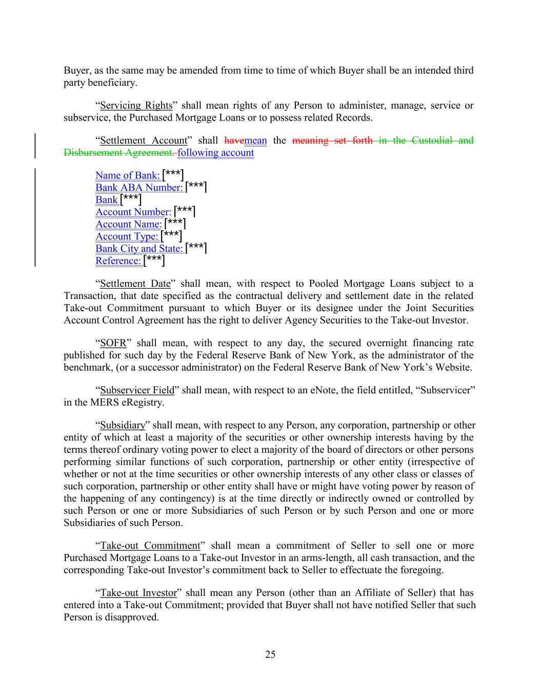 Buyer, as the same may be amended from time to time of which Buyer shall be an intended third party beneficiary. “Servicing Rights” shall mean rights of any Person to administer, manage, service or subservice, the Purchased Mortgage Loans or to possess related Records. “Settlement Account” shall havemean the meaning set forth in the Custodial and Disbursement Agreement. following account Name of Bank: Bank ABA Number: Bank Account Number: Account Name: Account Type: Bank City and State: Reference: “Settlement Date” shall mean, with respect to Pooled Mortgage Loans subject to a Transaction, that date specified as the contractual delivery and settlement date in the related Take-out Commitment pursuant to which Buyer or its designee under the Joint Securities Account Control Agreement has the right to deliver Agency Securities to the Take-out Investor. “SOFR” shall mean, with respect to any day, the secured overnight financing rate published for such day by the Federal Reserve Bank of New York, as the administrator of the benchmark, (or a successor administrator) on the Federal Reserve Bank of New York’s Website. “Subservicer Field” shall mean, with respect to an eNote, the field entitled, “Subservicer” in the MERS eRegistry. “Subsidiary” shall mean, with respect to any Person, any corporation, partnership or other entity of which at least a majority of the securities or other ownership interests having by the terms thereof ordinary voting power to elect a majority of the board of directors or other persons performing similar functions of such corporation, partnership or other entity (irrespective of whether or not at the time securities or other ownership interests of any other class or classes of such corporation, partnership or other entity shall have or might have voting power by reason of the happening of any contingency) is at the time directly or indirectly owned or controlled by such Person or one or more Subsidiaries of such Person or by such Person and one or more Subsidiaries of such Person. “Take-out Commitment” shall mean a commitment of Seller to sell one or more Purchased Mortgage Loans to a Take-out Investor in an arms-length, all cash transaction, and the corresponding Take-out Investor’s commitment back to Seller to effectuate the foregoing. “Take-out Investor” shall mean any Person (other than an Affiliate of Seller) that has entered into a Take-out Commitment; provided that Buyer shall not have notified Seller that such Person is disapproved. 25 [***] [***] [***] [***] [***] [***] [***] [***]