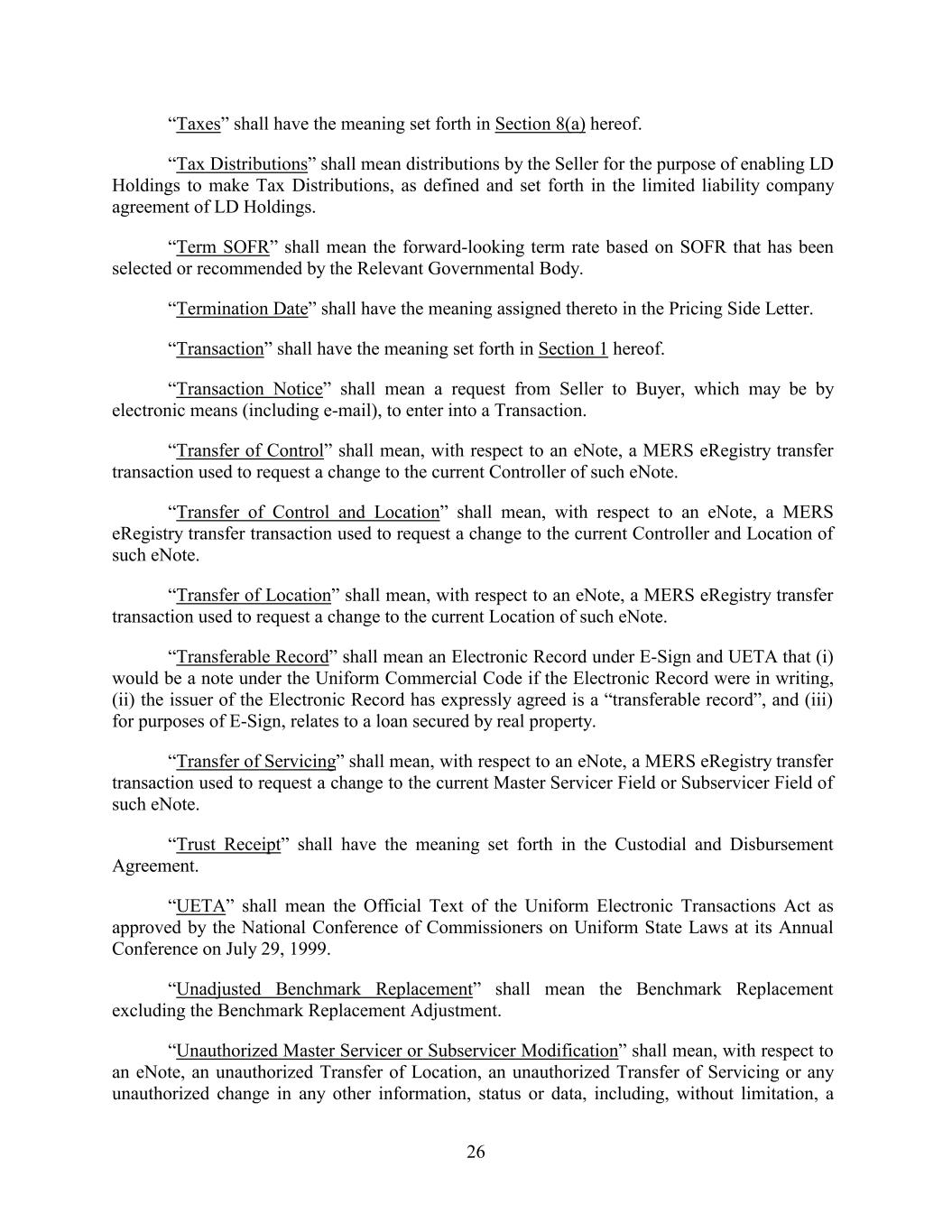 “Taxes” shall have the meaning set forth in Section 8(a) hereof. “Tax Distributions” shall mean distributions by the Seller for the purpose of enabling LD Holdings to make Tax Distributions, as defined and set forth in the limited liability company agreement of LD Holdings. “Term SOFR” shall mean the forward-looking term rate based on SOFR that has been selected or recommended by the Relevant Governmental Body. “Termination Date” shall have the meaning assigned thereto in the Pricing Side Letter. “Transaction” shall have the meaning set forth in Section 1 hereof. “Transaction Notice” shall mean a request from Seller to Buyer, which may be by electronic means (including e-mail), to enter into a Transaction. “Transfer of Control” shall mean, with respect to an eNote, a MERS eRegistry transfer transaction used to request a change to the current Controller of such eNote. “Transfer of Control and Location” shall mean, with respect to an eNote, a MERS eRegistry transfer transaction used to request a change to the current Controller and Location of such eNote. “Transfer of Location” shall mean, with respect to an eNote, a MERS eRegistry transfer transaction used to request a change to the current Location of such eNote. “Transferable Record” shall mean an Electronic Record under E-Sign and UETA that (i) would be a note under the Uniform Commercial Code if the Electronic Record were in writing, (ii) the issuer of the Electronic Record has expressly agreed is a “transferable record”, and (iii) for purposes of E-Sign, relates to a loan secured by real property. “Transfer of Servicing” shall mean, with respect to an eNote, a MERS eRegistry transfer transaction used to request a change to the current Master Servicer Field or Subservicer Field of such eNote. “Trust Receipt” shall have the meaning set forth in the Custodial and Disbursement Agreement. “UETA” shall mean the Official Text of the Uniform Electronic Transactions Act as approved by the National Conference of Commissioners on Uniform State Laws at its Annual Conference on July 29, 1999. “Unadjusted Benchmark Replacement” shall mean the Benchmark Replacement excluding the Benchmark Replacement Adjustment. “Unauthorized Master Servicer or Subservicer Modification” shall mean, with respect to an eNote, an unauthorized Transfer of Location, an unauthorized Transfer of Servicing or any unauthorized change in any other information, status or data, including, without limitation, a 26