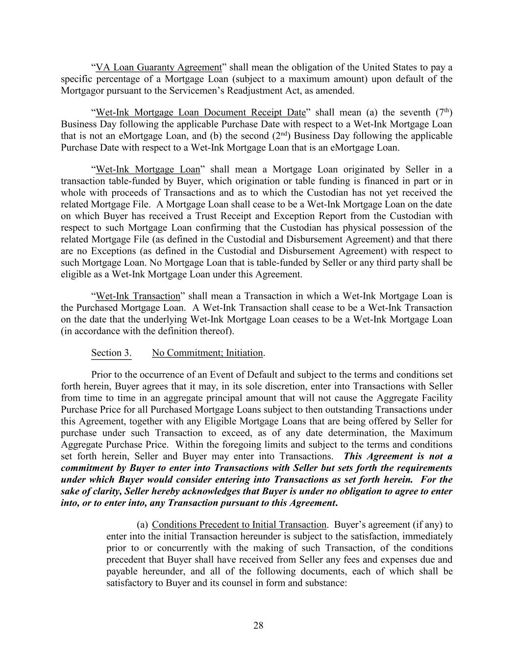 “VA Loan Guaranty Agreement” shall mean the obligation of the United States to pay a specific percentage of a Mortgage Loan (subject to a maximum amount) upon default of the Mortgagor pursuant to the Servicemen’s Readjustment Act, as amended. “Wet-Ink Mortgage Loan Document Receipt Date” shall mean (a) the seventh (7th) Business Day following the applicable Purchase Date with respect to a Wet-Ink Mortgage Loan that is not an eMortgage Loan, and (b) the second (2nd) Business Day following the applicable Purchase Date with respect to a Wet-Ink Mortgage Loan that is an eMortgage Loan. “Wet-Ink Mortgage Loan” shall mean a Mortgage Loan originated by Seller in a transaction table-funded by Buyer, which origination or table funding is financed in part or in whole with proceeds of Transactions and as to which the Custodian has not yet received the related Mortgage File. A Mortgage Loan shall cease to be a Wet-Ink Mortgage Loan on the date on which Buyer has received a Trust Receipt and Exception Report from the Custodian with respect to such Mortgage Loan confirming that the Custodian has physical possession of the related Mortgage File (as defined in the Custodial and Disbursement Agreement) and that there are no Exceptions (as defined in the Custodial and Disbursement Agreement) with respect to such Mortgage Loan. No Mortgage Loan that is table-funded by Seller or any third party shall be eligible as a Wet-Ink Mortgage Loan under this Agreement. “Wet-Ink Transaction” shall mean a Transaction in which a Wet-Ink Mortgage Loan is the Purchased Mortgage Loan. A Wet-Ink Transaction shall cease to be a Wet-Ink Transaction on the date that the underlying Wet-Ink Mortgage Loan ceases to be a Wet-Ink Mortgage Loan (in accordance with the definition thereof). Section 3. No Commitment; Initiation. Prior to the occurrence of an Event of Default and subject to the terms and conditions set forth herein, Buyer agrees that it may, in its sole discretion, enter into Transactions with Seller from time to time in an aggregate principal amount that will not cause the Aggregate Facility Purchase Price for all Purchased Mortgage Loans subject to then outstanding Transactions under this Agreement, together with any Eligible Mortgage Loans that are being offered by Seller for purchase under such Transaction to exceed, as of any date determination, the Maximum Aggregate Purchase Price. Within the foregoing limits and subject to the terms and conditions set forth herein, Seller and Buyer may enter into Transactions. This Agreement is not a commitment by Buyer to enter into Transactions with Seller but sets forth the requirements under which Buyer would consider entering into Transactions as set forth herein. For the sake of clarity, Seller hereby acknowledges that Buyer is under no obligation to agree to enter into, or to enter into, any Transaction pursuant to this Agreement. (a) Conditions Precedent to Initial Transaction. Buyer’s agreement (if any) to enter into the initial Transaction hereunder is subject to the satisfaction, immediately prior to or concurrently with the making of such Transaction, of the conditions precedent that Buyer shall have received from Seller any fees and expenses due and payable hereunder, and all of the following documents, each of which shall be satisfactory to Buyer and its counsel in form and substance: 28