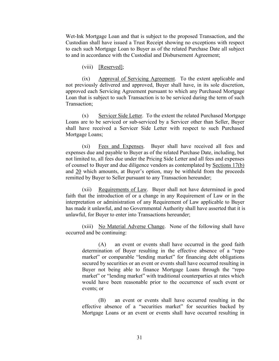 Wet-Ink Mortgage Loan and that is subject to the proposed Transaction, and the Custodian shall have issued a Trust Receipt showing no exceptions with respect to each such Mortgage Loan to Buyer as of the related Purchase Date all subject to and in accordance with the Custodial and Disbursement Agreement; (viii) [Reserved]; (ix) Approval of Servicing Agreement. To the extent applicable and not previously delivered and approved, Buyer shall have, in its sole discretion, approved each Servicing Agreement pursuant to which any Purchased Mortgage Loan that is subject to such Transaction is to be serviced during the term of such Transaction; (x) Servicer Side Letter. To the extent the related Purchased Mortgage Loans are to be serviced or sub-serviced by a Servicer other than Seller, Buyer shall have received a Servicer Side Letter with respect to such Purchased Mortgage Loans; (xi) Fees and Expenses. Buyer shall have received all fees and expenses due and payable to Buyer as of the related Purchase Date, including, but not limited to, all fees due under the Pricing Side Letter and all fees and expenses of counsel to Buyer and due diligence vendors as contemplated by Sections 17(b) and 20 which amounts, at Buyer’s option, may be withheld from the proceeds remitted by Buyer to Seller pursuant to any Transaction hereunder; (xii) Requirements of Law. Buyer shall not have determined in good faith that the introduction of or a change in any Requirement of Law or in the interpretation or administration of any Requirement of Law applicable to Buyer has made it unlawful, and no Governmental Authority shall have asserted that it is unlawful, for Buyer to enter into Transactions hereunder; (xiii) No Material Adverse Change. None of the following shall have occurred and be continuing: (A) an event or events shall have occurred in the good faith determination of Buyer resulting in the effective absence of a “repo market” or comparable “lending market” for financing debt obligations secured by securities or an event or events shall have occurred resulting in Buyer not being able to finance Mortgage Loans through the “repo market” or “lending market” with traditional counterparties at rates which would have been reasonable prior to the occurrence of such event or events; or (B) an event or events shall have occurred resulting in the effective absence of a “securities market” for securities backed by Mortgage Loans or an event or events shall have occurred resulting in 31