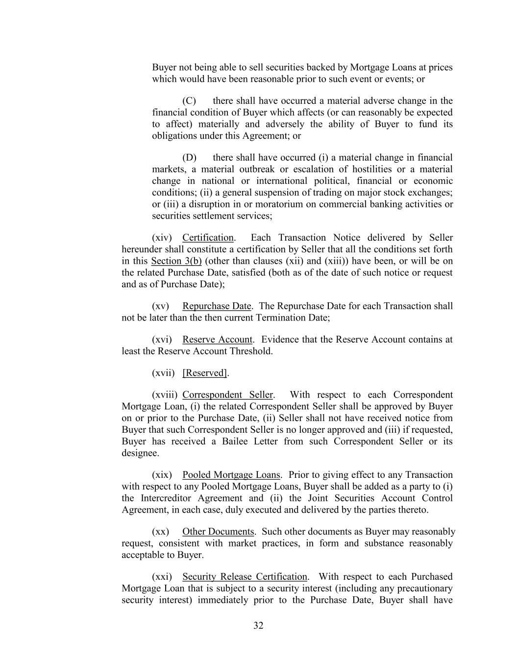 Buyer not being able to sell securities backed by Mortgage Loans at prices which would have been reasonable prior to such event or events; or (C) there shall have occurred a material adverse change in the financial condition of Buyer which affects (or can reasonably be expected to affect) materially and adversely the ability of Buyer to fund its obligations under this Agreement; or (D) there shall have occurred (i) a material change in financial markets, a material outbreak or escalation of hostilities or a material change in national or international political, financial or economic conditions; (ii) a general suspension of trading on major stock exchanges; or (iii) a disruption in or moratorium on commercial banking activities or securities settlement services; (xiv) Certification. Each Transaction Notice delivered by Seller hereunder shall constitute a certification by Seller that all the conditions set forth in this Section 3(b) (other than clauses (xii) and (xiii)) have been, or will be on the related Purchase Date, satisfied (both as of the date of such notice or request and as of Purchase Date); (xv) Repurchase Date. The Repurchase Date for each Transaction shall not be later than the then current Termination Date; (xvi) Reserve Account. Evidence that the Reserve Account contains at least the Reserve Account Threshold. (xvii) [Reserved]. (xviii) Correspondent Seller. With respect to each Correspondent Mortgage Loan, (i) the related Correspondent Seller shall be approved by Buyer on or prior to the Purchase Date, (ii) Seller shall not have received notice from Buyer that such Correspondent Seller is no longer approved and (iii) if requested, Buyer has received a Bailee Letter from such Correspondent Seller or its designee. (xix) Pooled Mortgage Loans. Prior to giving effect to any Transaction with respect to any Pooled Mortgage Loans, Buyer shall be added as a party to (i) the Intercreditor Agreement and (ii) the Joint Securities Account Control Agreement, in each case, duly executed and delivered by the parties thereto. (xx) Other Documents. Such other documents as Buyer may reasonably request, consistent with market practices, in form and substance reasonably acceptable to Buyer. (xxi) Security Release Certification. With respect to each Purchased Mortgage Loan that is subject to a security interest (including any precautionary security interest) immediately prior to the Purchase Date, Buyer shall have 32