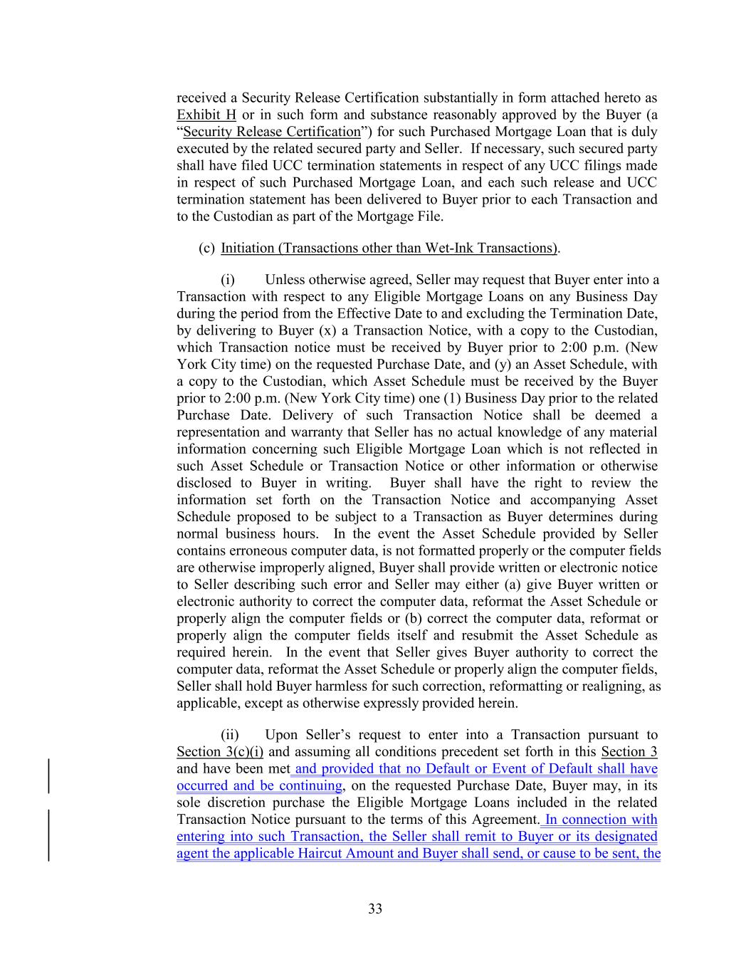 received a Security Release Certification substantially in form attached hereto as Exhibit H or in such form and substance reasonably approved by the Buyer (a “Security Release Certification”) for such Purchased Mortgage Loan that is duly executed by the related secured party and Seller. If necessary, such secured party shall have filed UCC termination statements in respect of any UCC filings made in respect of such Purchased Mortgage Loan, and each such release and UCC termination statement has been delivered to Buyer prior to each Transaction and to the Custodian as part of the Mortgage File. (c) Initiation (Transactions other than Wet-Ink Transactions). (i) Unless otherwise agreed, Seller may request that Buyer enter into a Transaction with respect to any Eligible Mortgage Loans on any Business Day during the period from the Effective Date to and excluding the Termination Date, by delivering to Buyer (x) a Transaction Notice, with a copy to the Custodian, which Transaction notice must be received by Buyer prior to 2:00 p.m. (New York City time) on the requested Purchase Date, and (y) an Asset Schedule, with a copy to the Custodian, which Asset Schedule must be received by the Buyer prior to 2:00 p.m. (New York City time) one (1) Business Day prior to the related Purchase Date. Delivery of such Transaction Notice shall be deemed a representation and warranty that Seller has no actual knowledge of any material information concerning such Eligible Mortgage Loan which is not reflected in such Asset Schedule or Transaction Notice or other information or otherwise disclosed to Buyer in writing. Buyer shall have the right to review the information set forth on the Transaction Notice and accompanying Asset Schedule proposed to be subject to a Transaction as Buyer determines during normal business hours. In the event the Asset Schedule provided by Seller contains erroneous computer data, is not formatted properly or the computer fields are otherwise improperly aligned, Buyer shall provide written or electronic notice to Seller describing such error and Seller may either (a) give Buyer written or electronic authority to correct the computer data, reformat the Asset Schedule or properly align the computer fields or (b) correct the computer data, reformat or properly align the computer fields itself and resubmit the Asset Schedule as required herein. In the event that Seller gives Buyer authority to correct the computer data, reformat the Asset Schedule or properly align the computer fields, Seller shall hold Buyer harmless for such correction, reformatting or realigning, as applicable, except as otherwise expressly provided herein. (ii) Upon Seller’s request to enter into a Transaction pursuant to Section 3(c)(i) and assuming all conditions precedent set forth in this Section 3 and have been met and provided that no Default or Event of Default shall have occurred and be continuing, on the requested Purchase Date, Buyer may, in its sole discretion purchase the Eligible Mortgage Loans included in the related Transaction Notice pursuant to the terms of this Agreement. In connection with entering into such Transaction, the Seller shall remit to Buyer or its designated agent the applicable Haircut Amount and Buyer shall send, or cause to be sent, the 33